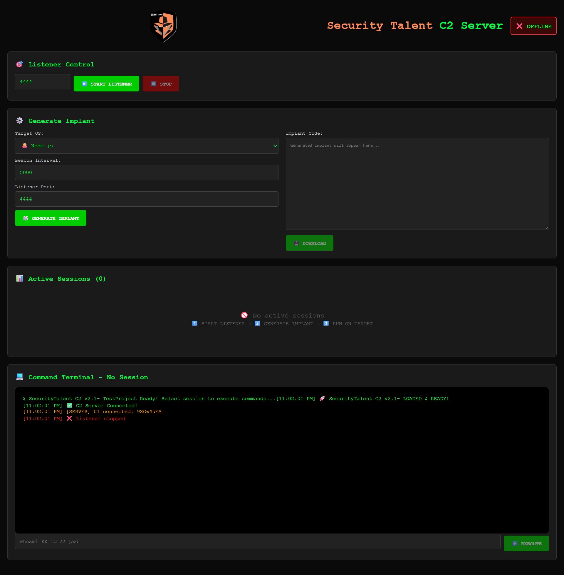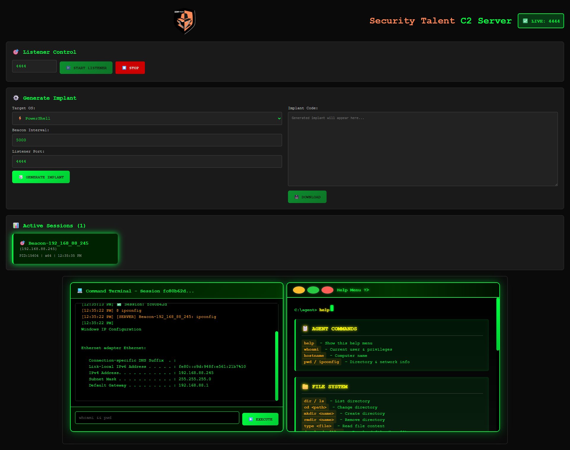 Security Talent Command and Control (C2) Server (TestProject) Use this code for Educational Purpose only.