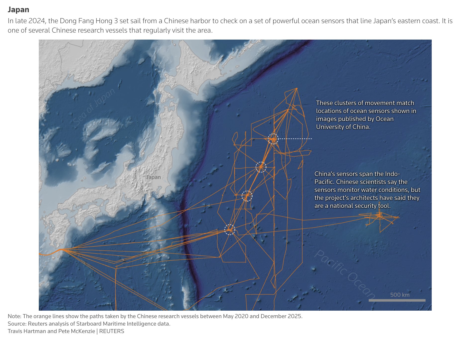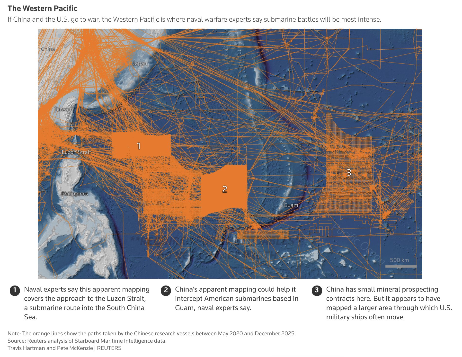 "Los datos de seguimiento marítimo muestran que el esfuerzo chino de relevamiento del lecho marino está centrado, en parte, en aguas militarmente importantes alrededor de Filipinas, cerca de Guam y Hawái, y cerca de instalaciones militares de Estados Unidos en el atolón Wake, en el Pacífico norte."
