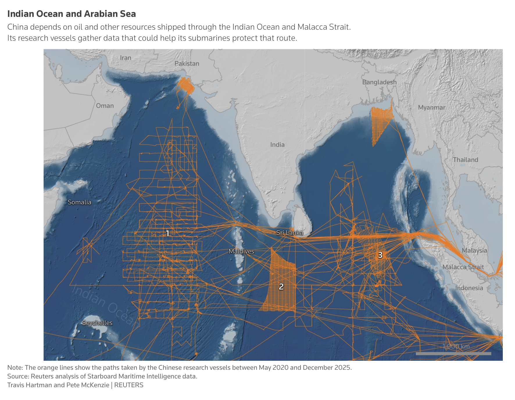 "Si bien la investigación tiene fines civiles —parte del relevamiento cubre zonas de pesca o áreas donde China tiene contratos de prospección minera— también cumple una función militar, según nueve expertos en guerra naval que revisaron los hallazgos de Reuters."