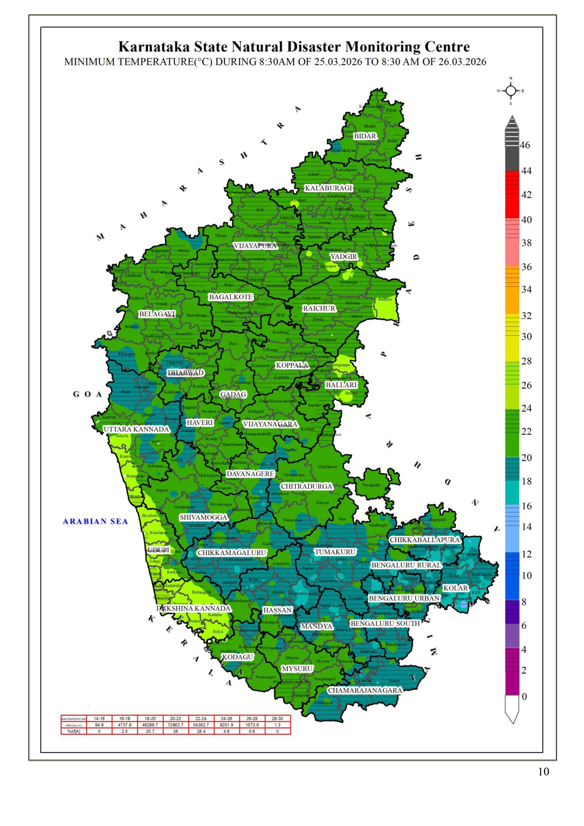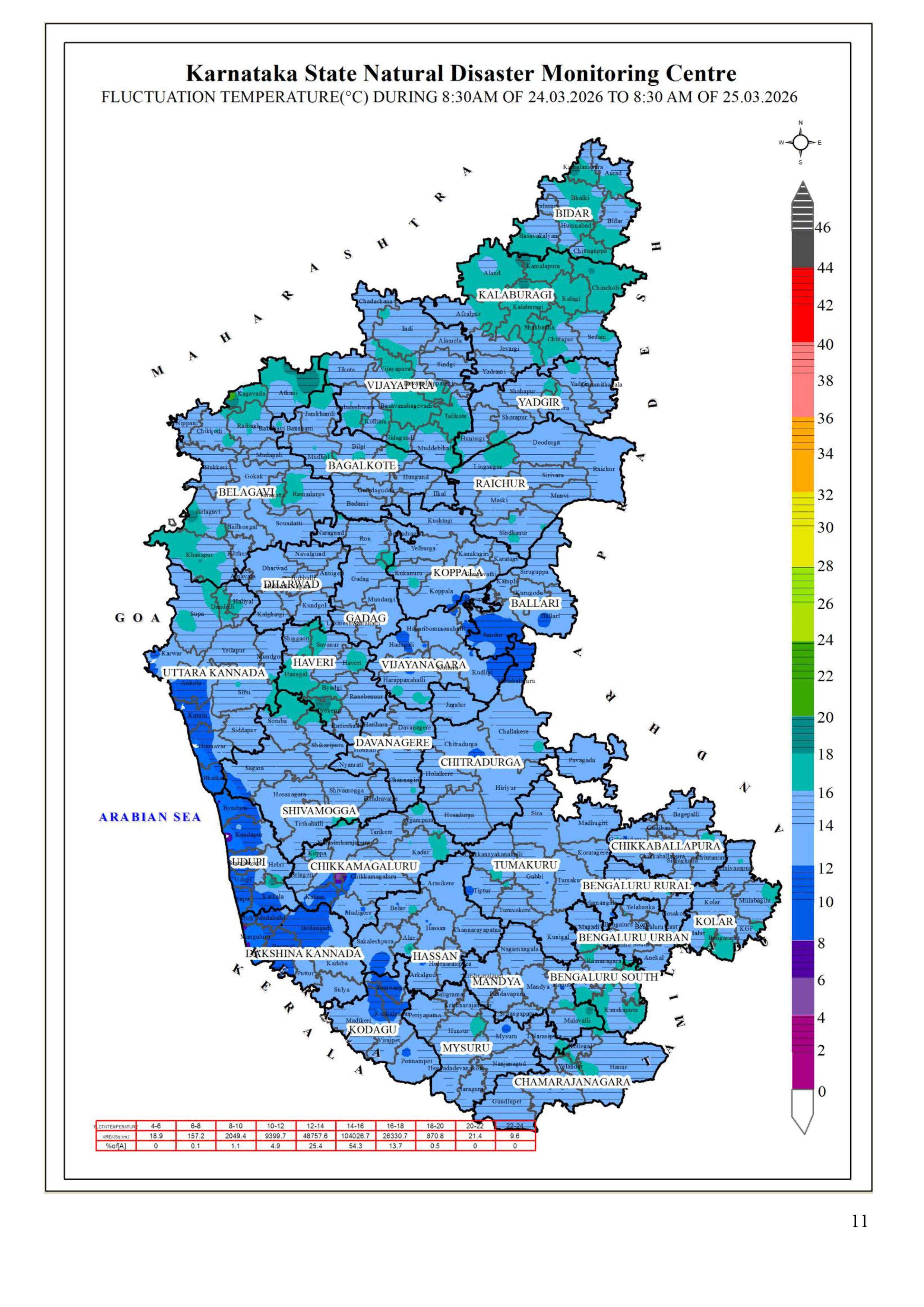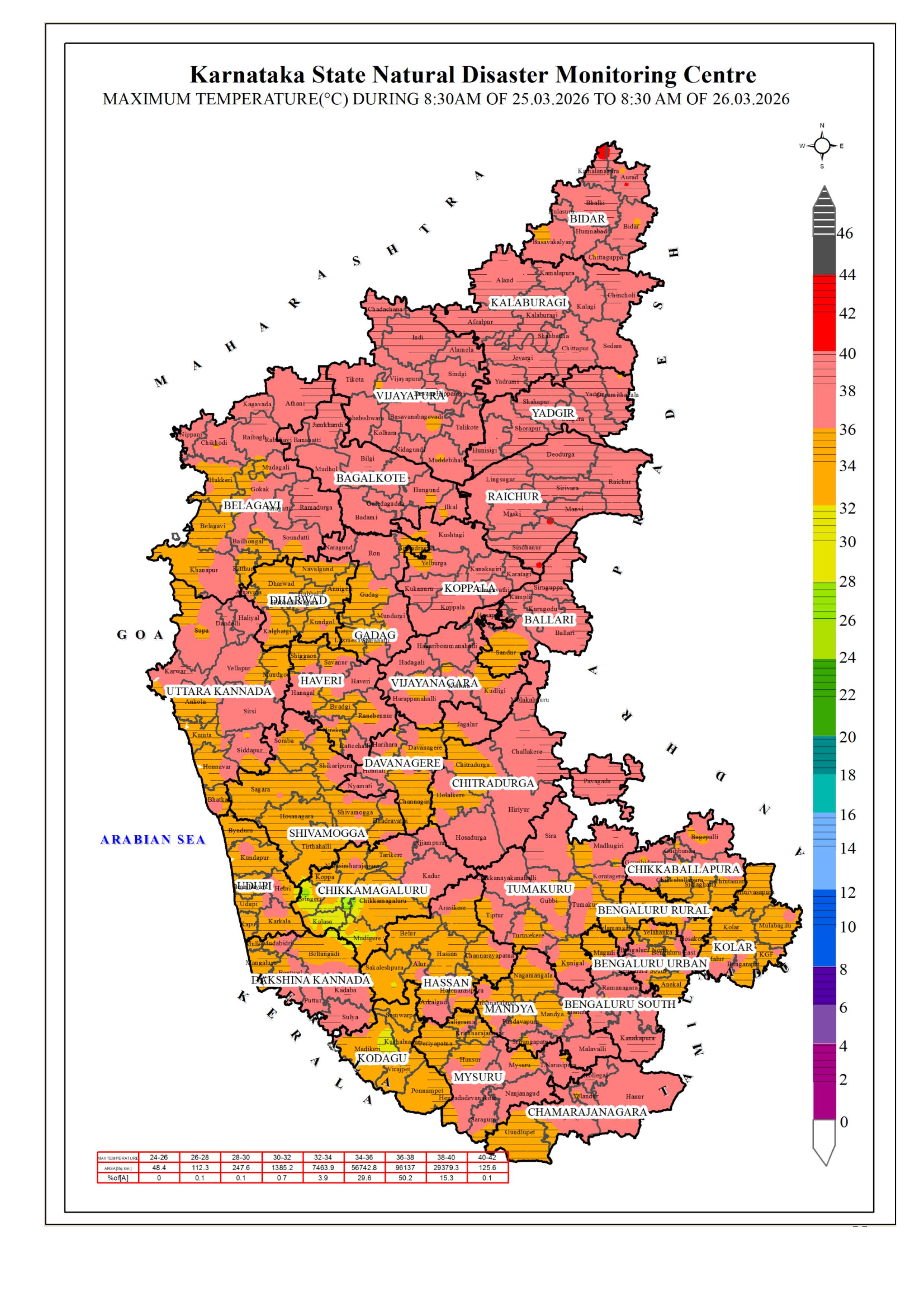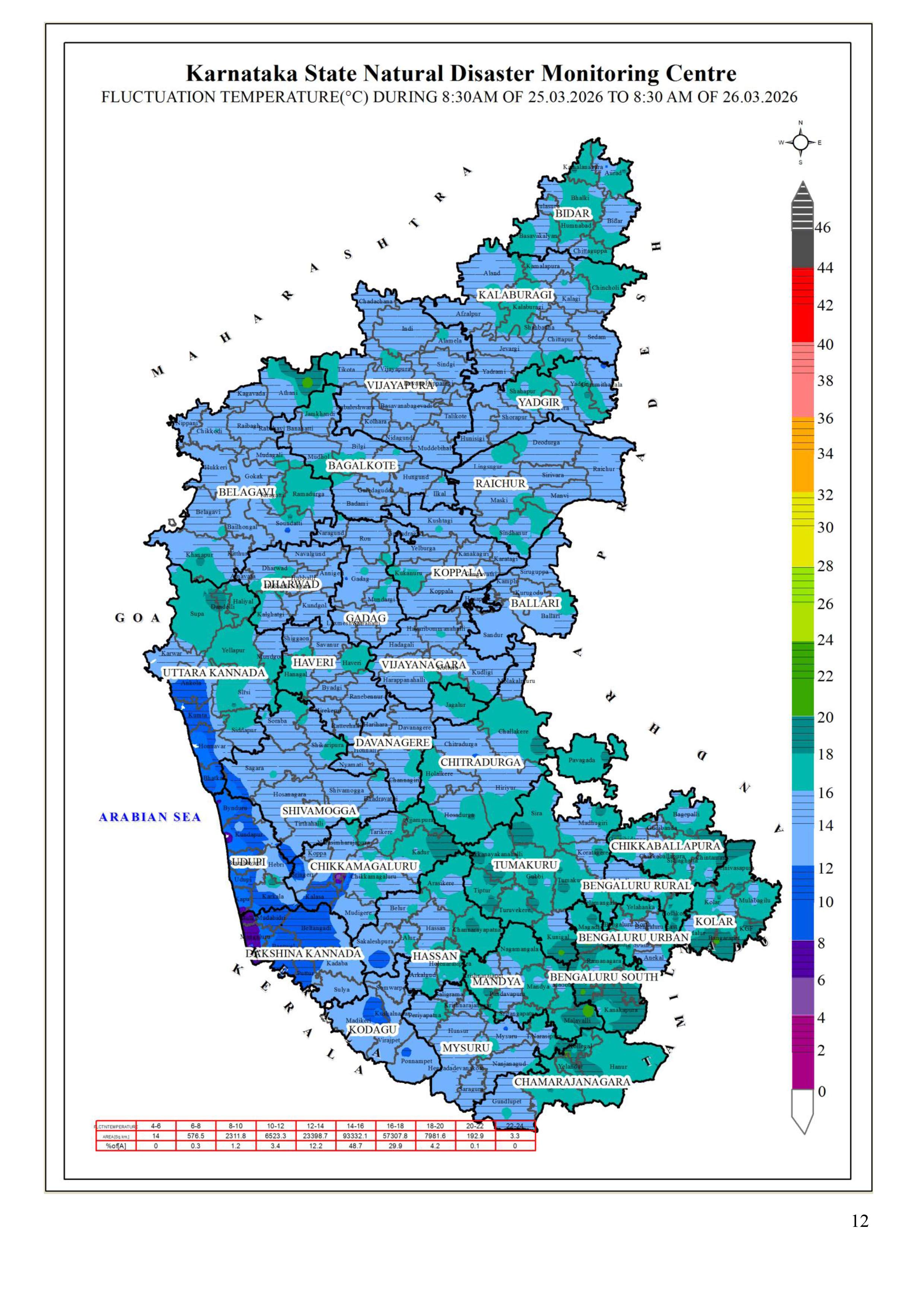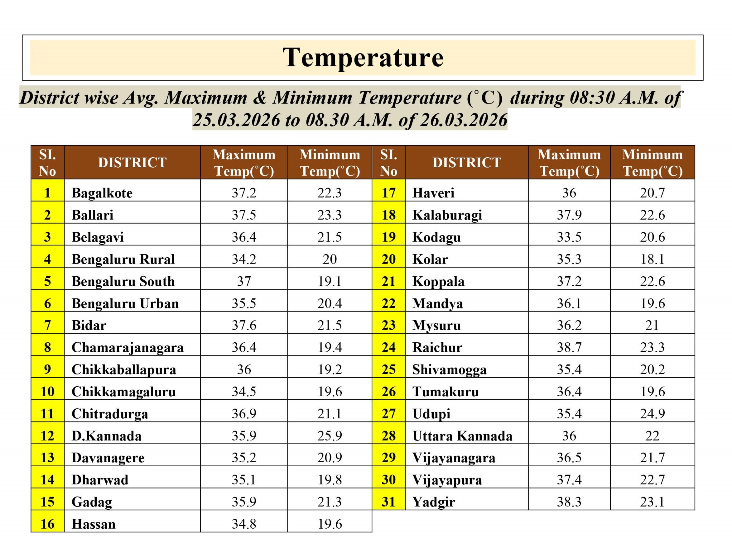 25.03.26 ರ 08.30 AM ನಿಂದ 26.03.26 ರ 08.30 AM ವರೆಗೆ ನಕ್ಷೆಗಳೊಂದಿಗೆ ಜಿಲ್ಲಾವಾರು ಸರಾಸರಿ ಕನಿಷ್ಠ, ಗರಿಷ್ಠ ಮತ್ತು ಏರಿಳಿತ ತಾಪಮಾನ(°C) ಕೋಷ್ಟಕ. District-wise Average #Minimum, #Maximum & Fluctuation #temperature (°C) table with maps from 08.30 AM of 25.03.26 to 08.30 AM of 26.03.26. #KSNDMC