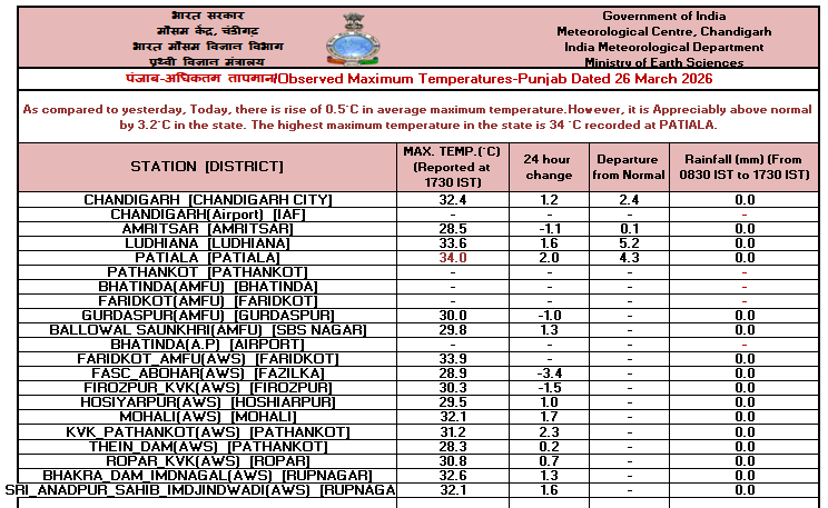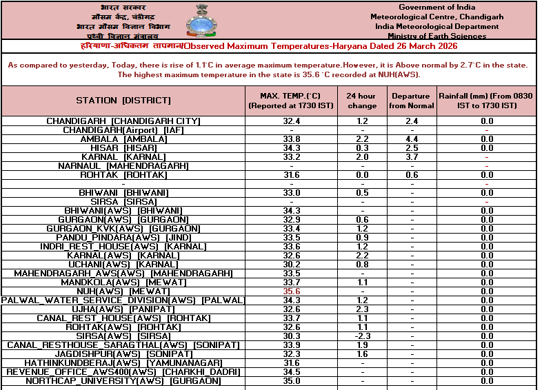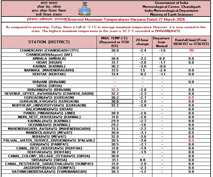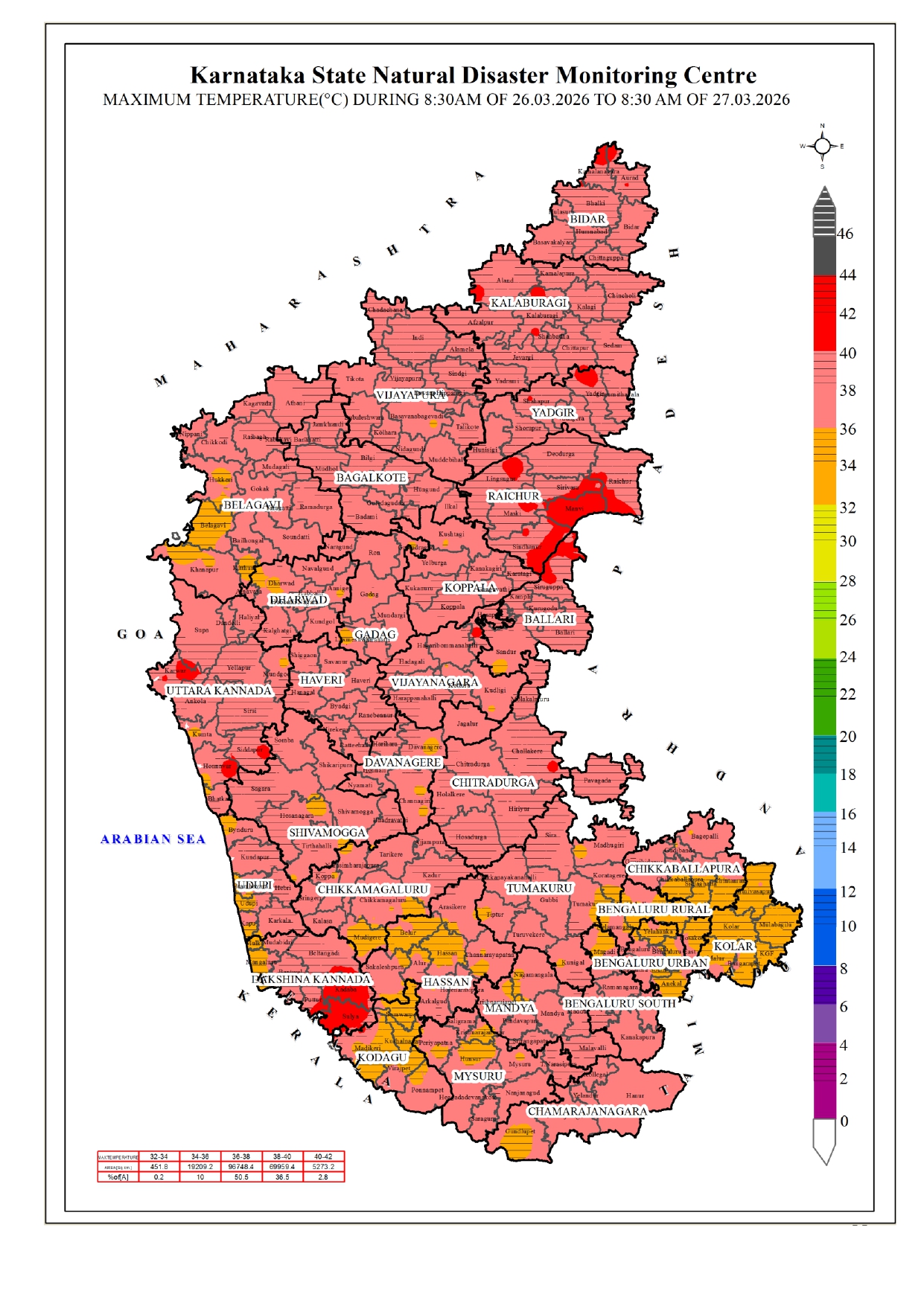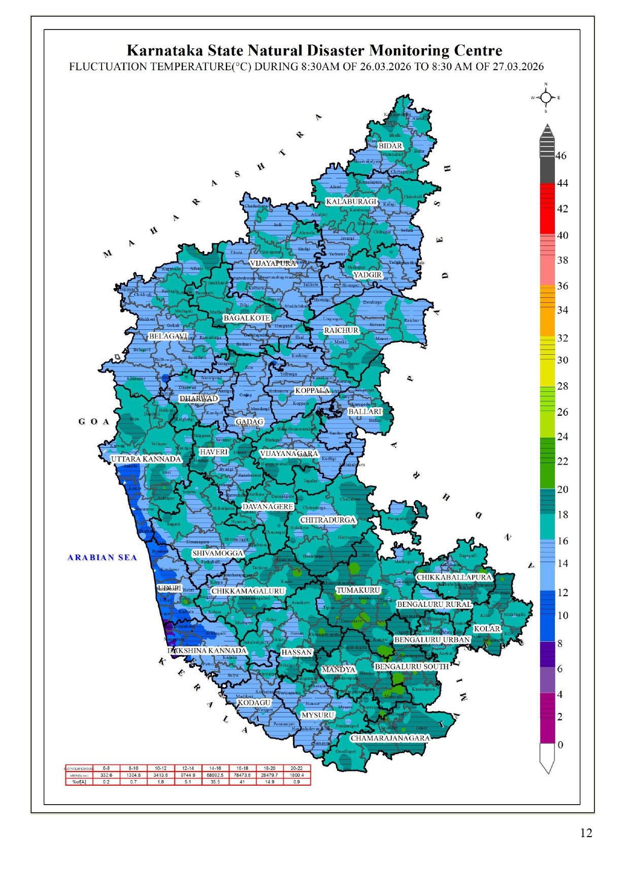 26.03.26 ರ 08.30 AM ನಿಂದ 27.03.26 ರ 08.30 AM ವರೆಗೆ ನಕ್ಷೆಗಳೊಂದಿಗೆ ಜಿಲ್ಲಾವಾರು ಸರಾಸರಿ ಕನಿಷ್ಠ, ಗರಿಷ್ಠ ಮತ್ತು ಏರಿಳಿತ ತಾಪಮಾನ(°C) ಕೋಷ್ಟಕ. District-wise Average #Minimum, #Maximum & Fluctuation #temperature (°C) table with maps from 08.30 AM of 26.03.26 to 08.30 AM of 27.03.26. #KSNDMC