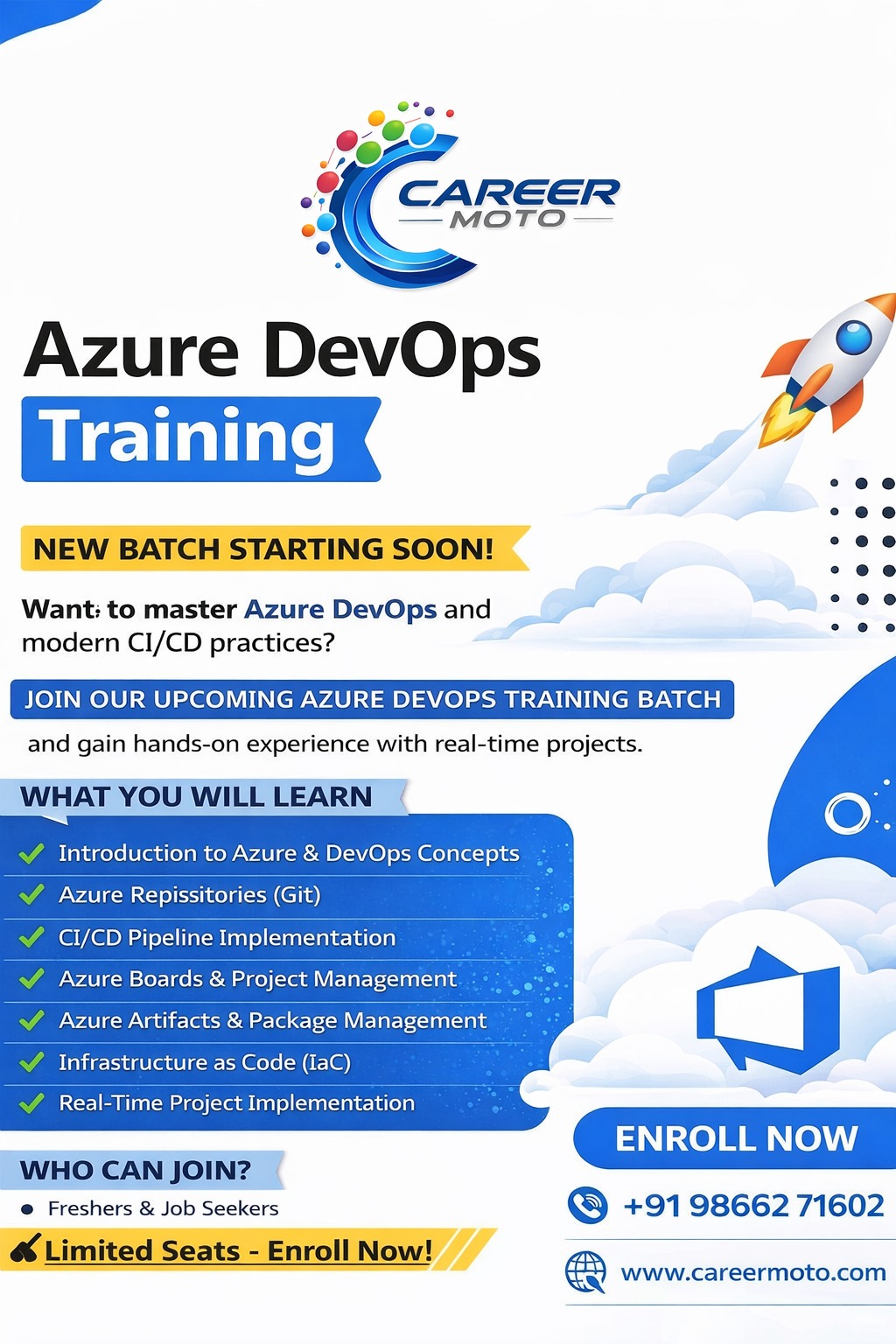 Kickstart your career in cloud computing with our expert-led Azure coaching program! At Career Moto, we provide hands-on training, real-time project experience, and industry-focused learning to help you master Microsoft Azure.