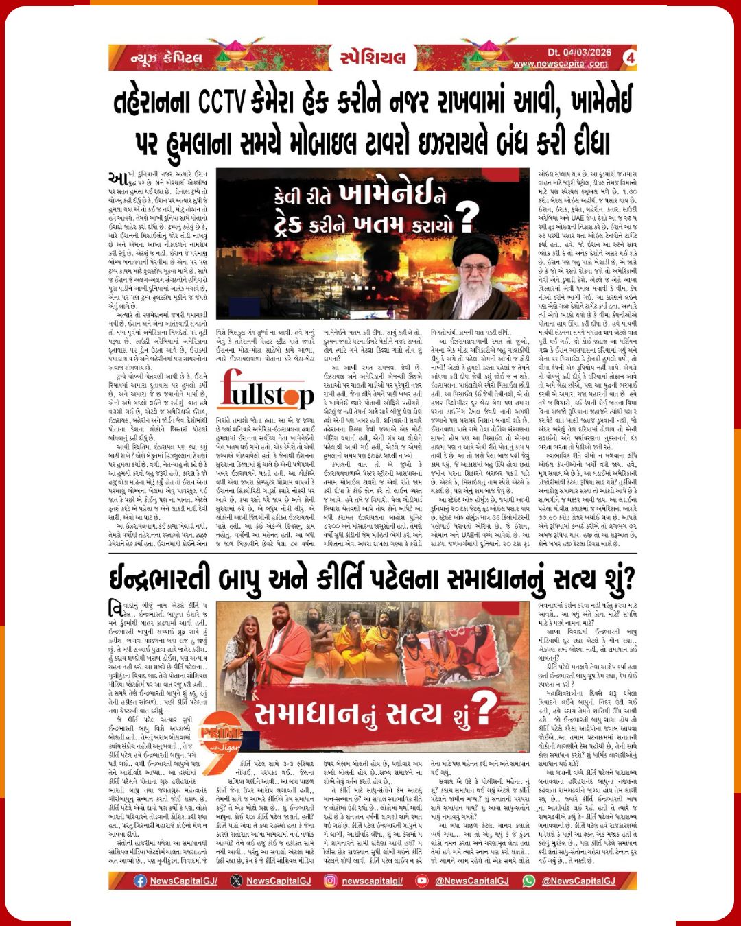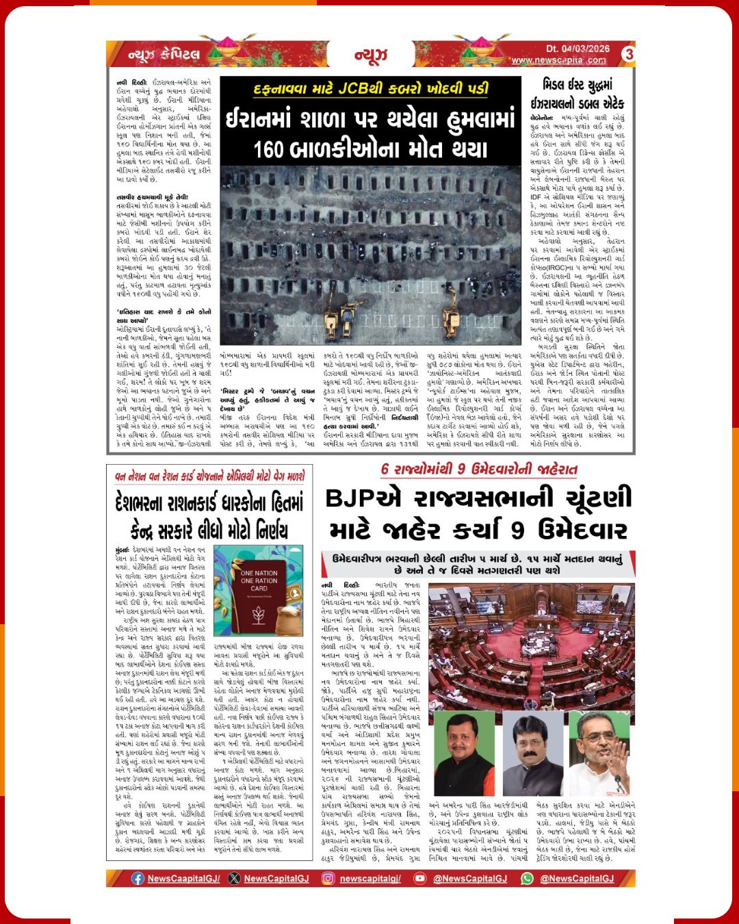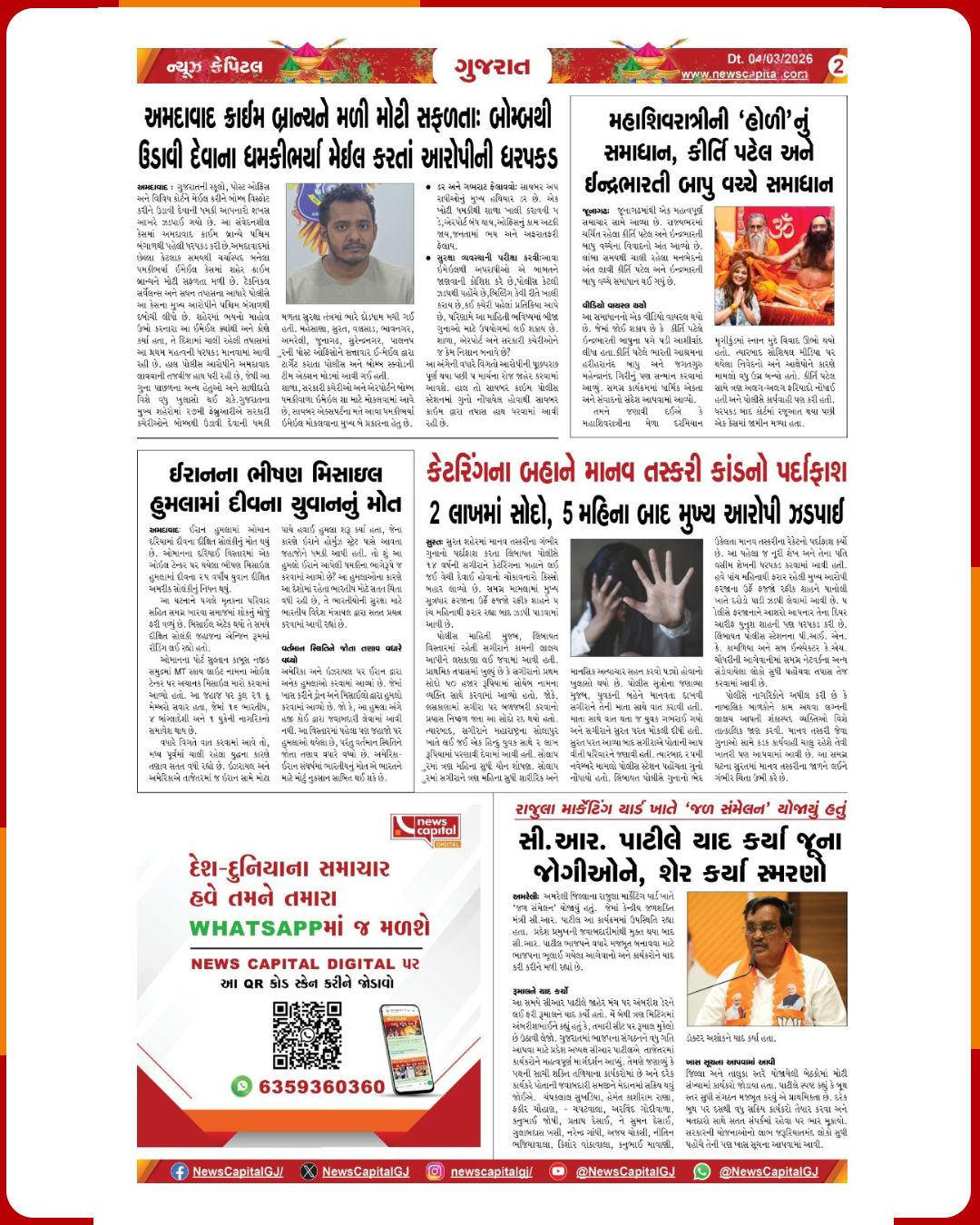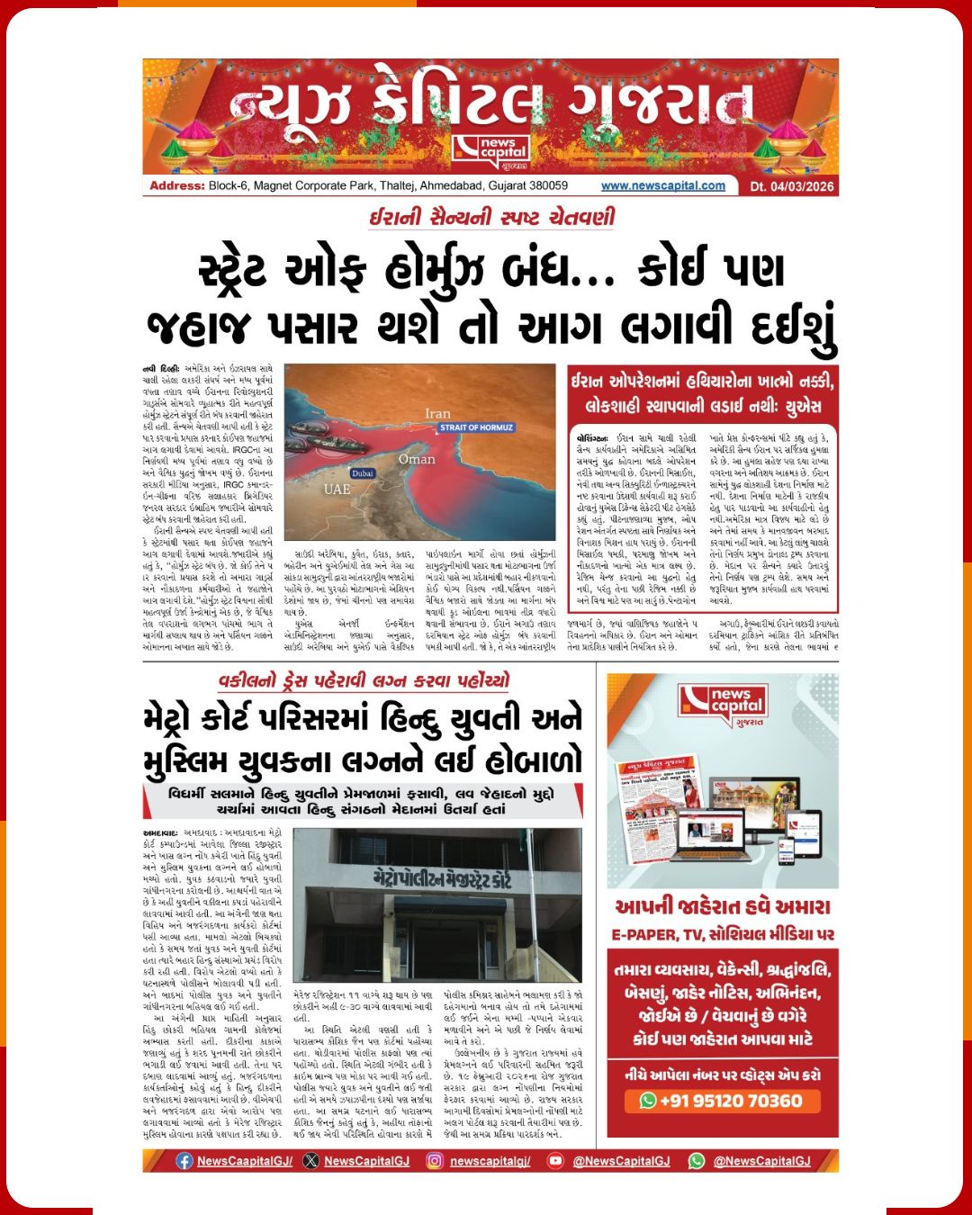 News Capital Digital @NewscapitalTeam · Mar 4 ઈરાની સૈન્યની સ્પષ્ટ ચેતવણી સ્ટ્રેટ ઓફ હોર્મુઝ બંધ... કોઈ પણ જહાજ પસાર થશે તો આગ લગાવી દઈશું અમદાવાદ ક્રાઈમ બ્રાન્ચને મળી મોટી સફળતા: બોમ્બથી ઉડાવી દેવાના ધમકીભર્યા મેઈલ કરતાં આરોપીની ધરપકડ #Iran #HormuzStrait #MilitaryWarning #BombThreat #Epaper 1 130