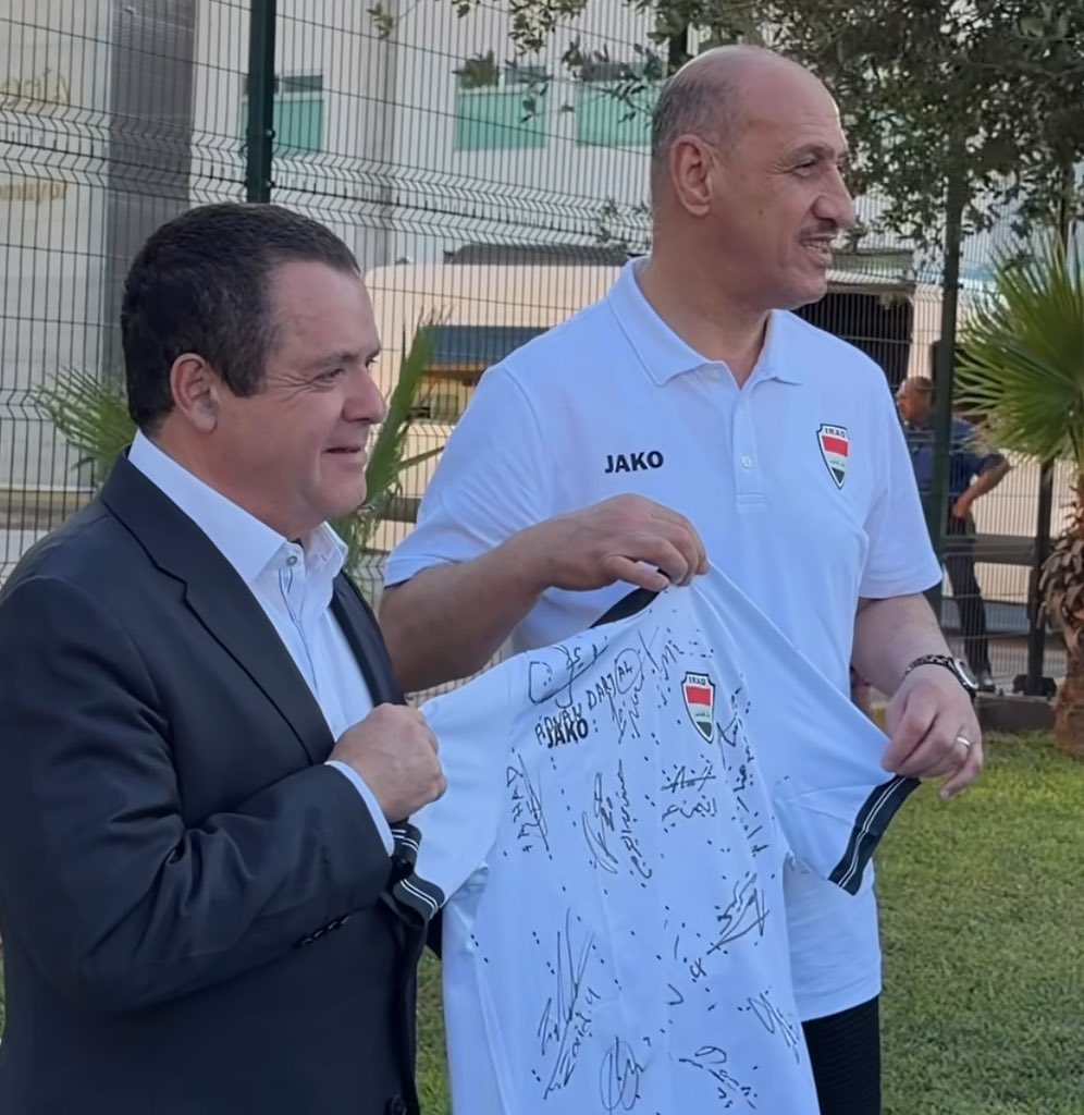 Captain Adnan Darjal presents an Iraqi national team jersey, signed by all the players, to the governor