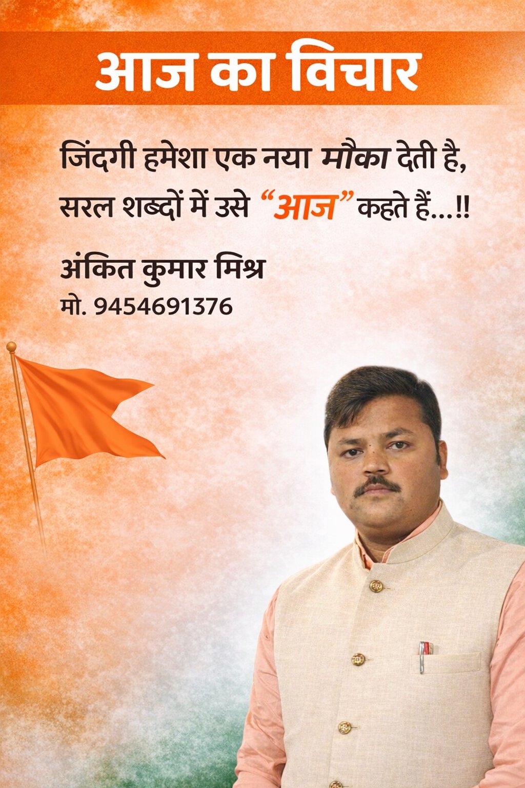 Ankit Kumar Mishra @MishraAnkitBjp1 · 42m जिंदगी हमेशा एक नया मौका देती है, सरल शब्दों में उसे “आज” कहते हैं...!! #सुप्रभात #morningpost #morningvibe #positiveenergychallenge 5