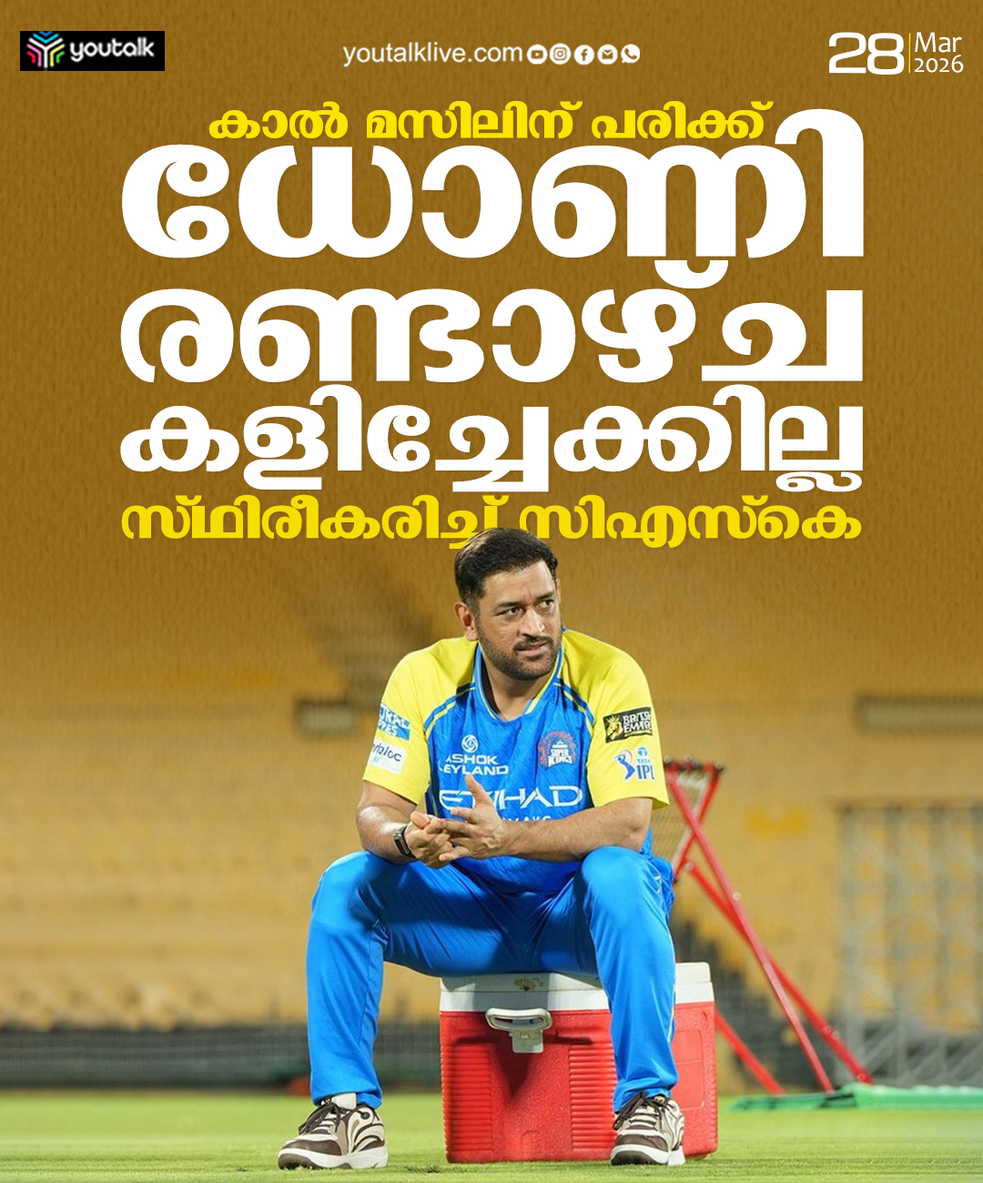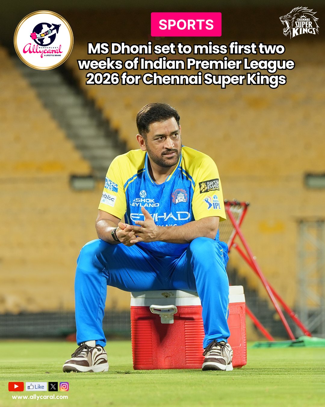 MS Dhoni ruled out for two weeks in IPL 2026, leaving Chennai Super Kings to adjust tactics and lineup without their captain.