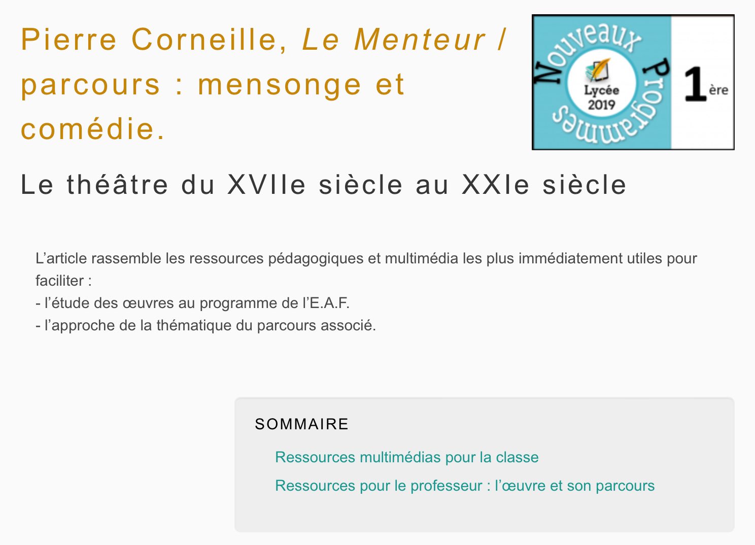 La Page des Lettres @PageDesLettres · Jul 26, 2024 🎭 [#Bac2025] Pierre Corneille, Le Menteur / Parcours « Mensonge et comédie » - lettres.ac-versailles.fr/spip.php?artic… ➡️ Ressources multimédia sur #LeMenteur de #multimédi, pour la classe et pour le professeurZ 2 1 258