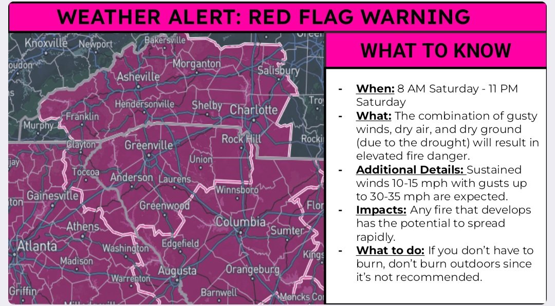 ALERT: Red flag/fire weather warning in effect for #NC, #SC, #GA, #AL, and #MS tomorrow. Info pertaining to the #fire danger is posted on this infographic.
