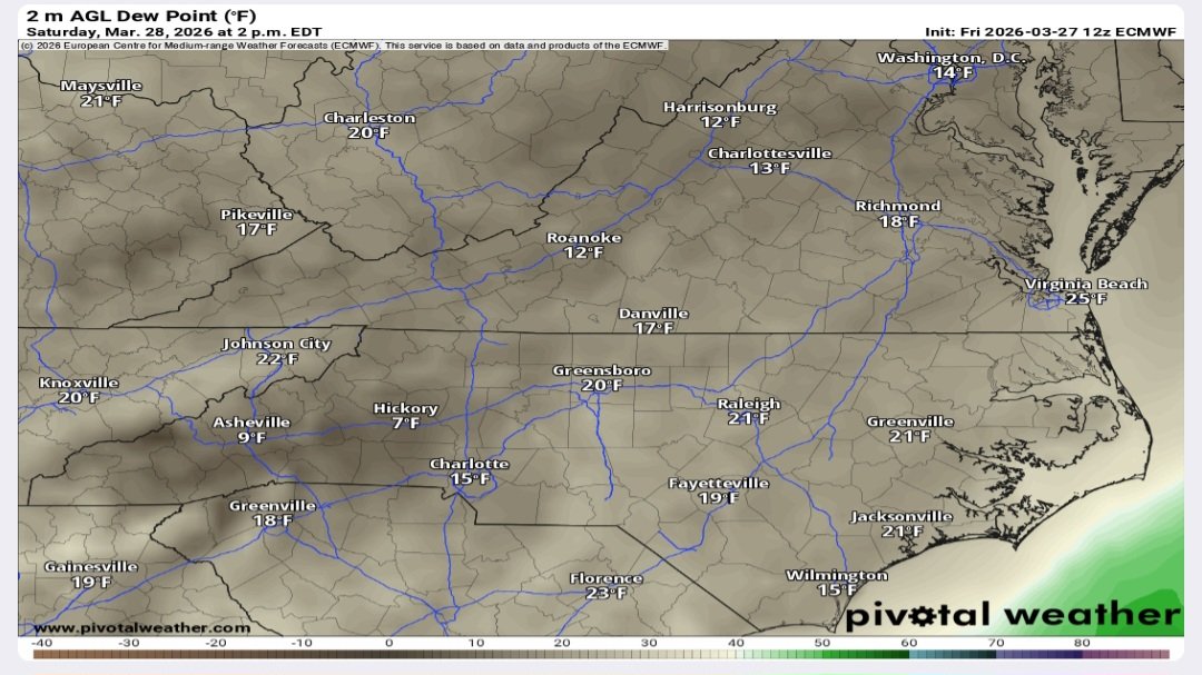 Dew points in the teens and single digits for several areas in #NC, #SC, #VA, #TN, #GA, #WV, and #KY. This is part of the reason why we have the elevated fire danger (plus the drought/dry brush and gusty winds). The air will be so dry it'll feel like you're in the desert.