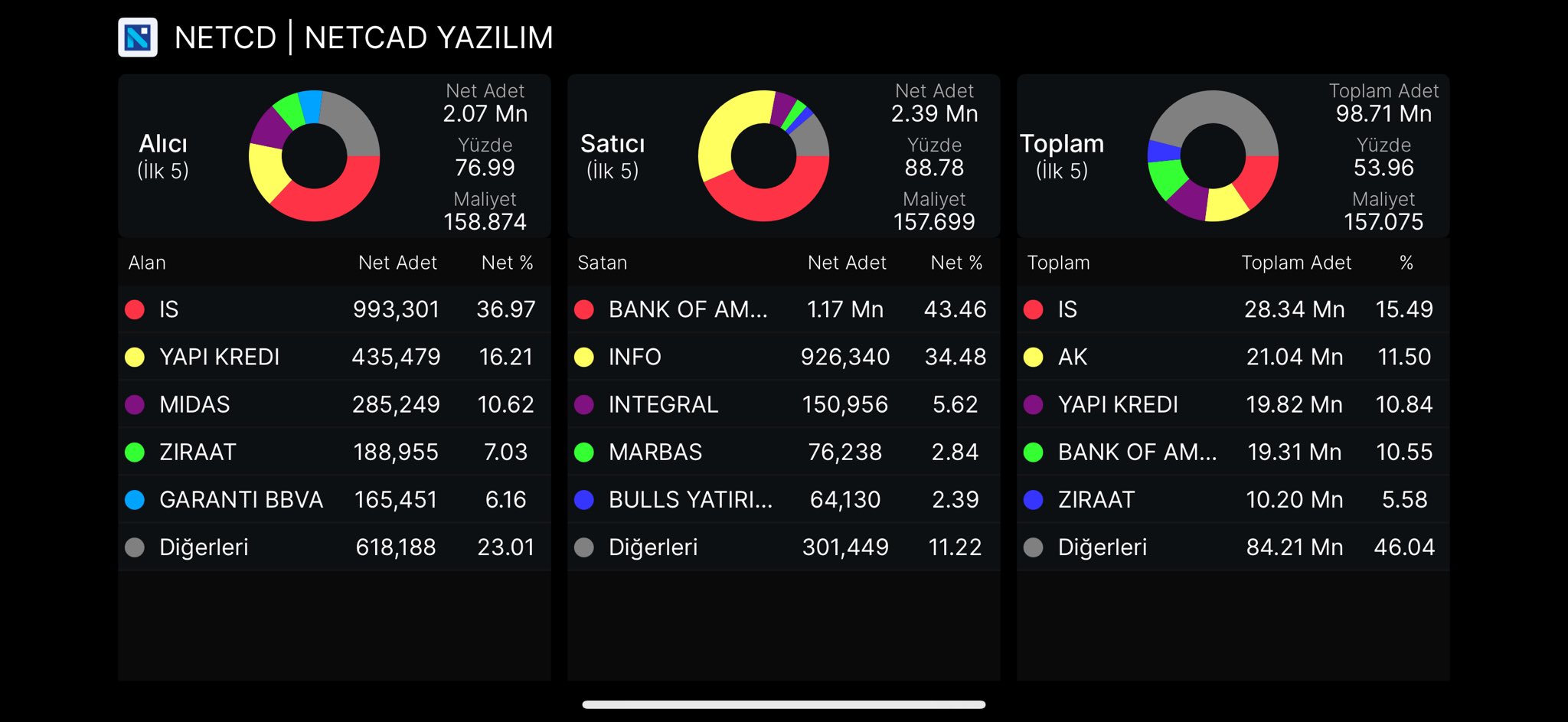 #netcd şimdi analize gelirsek, ilk takas paylaştığımda öncelikli İŞ, VAKIF ve YKREDİ lotlarını takip edeceğimizi söylemiştim. Bu son 20 günde bu üç kurum özellikle İŞ takası oldukça daralttı. Tahtanın yukarı sürümünde ve düzeltme sinde bank of etkili oldu.