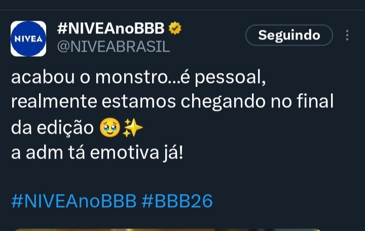 Meu momento chegou e eu estou muito Niveamando! #NIVEAnoBBB #BBB26 gratos somos pela oportunidade de viver isso. Foi único e especial