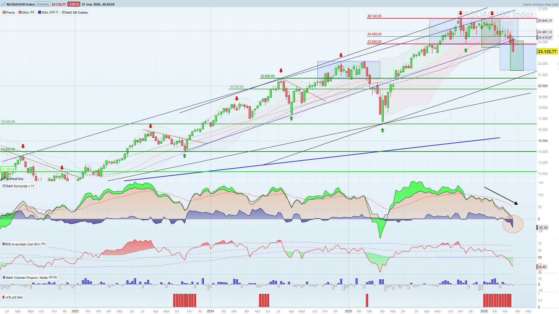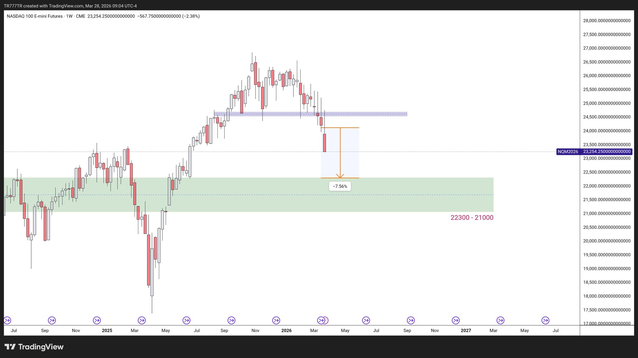 Bu hafta mor-lila kutunun yaklaşık 1200 puan aşağısında kapattık. #Nasdaq tarafında beklediğim aşağı yönde akış gayet iyi ilerliyor. Önümüzdeki hafta yeni ay açılışıyla birlikte fiyatın çizdiğim yeşil kutuya kadar gelmesi bile yaklaşık 1200 puan kaldı, yani yolun yarısını geçmiş durumdayız.
