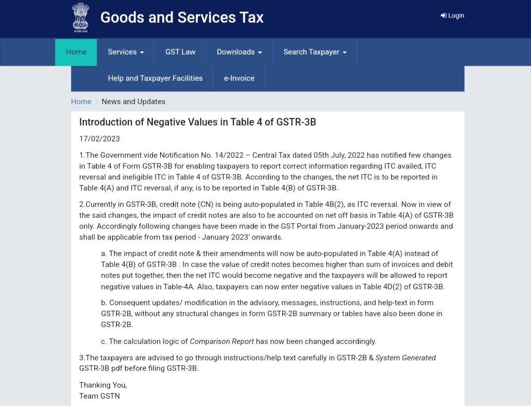 The GST Network (GSTN) has introduced a major update on the GST portal, allowing taxpayers to report negative values in Table 3.1 of GSTR-3B.