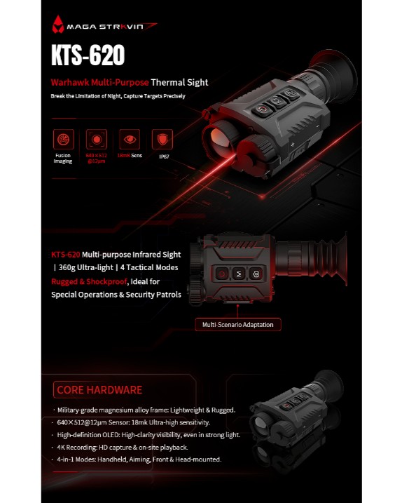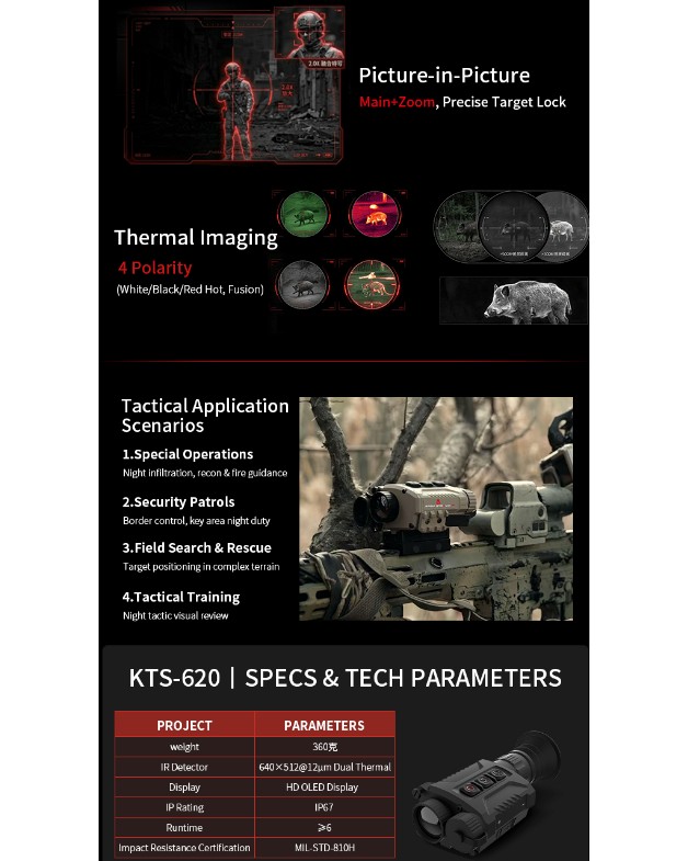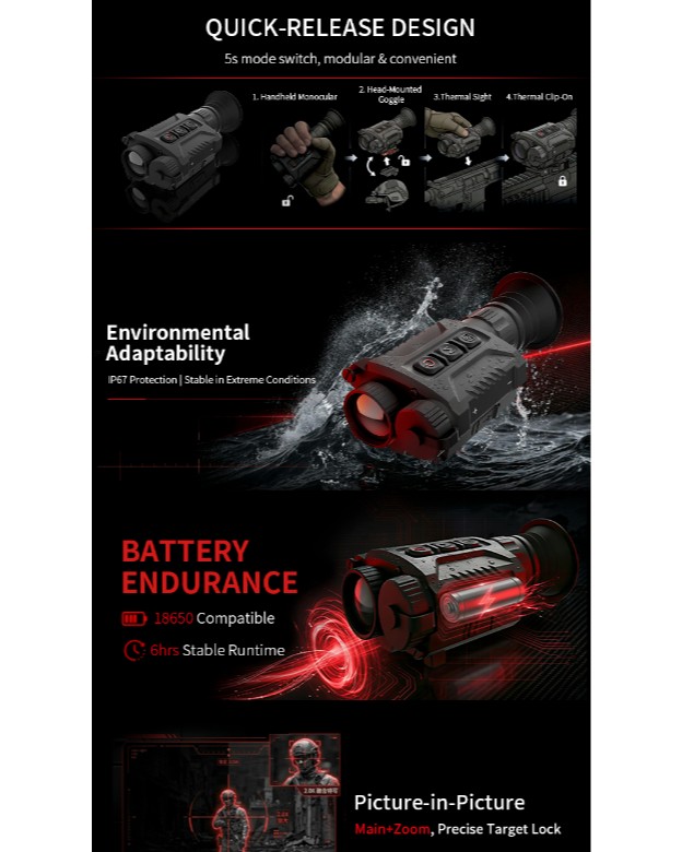 This multi-purpose thermal sight features 4 quick-release modes, 640×512 sensor, IP67 protection and 6hrs runtime. Ideal for tactical, patrol and rescue scenarios with precise target locking.