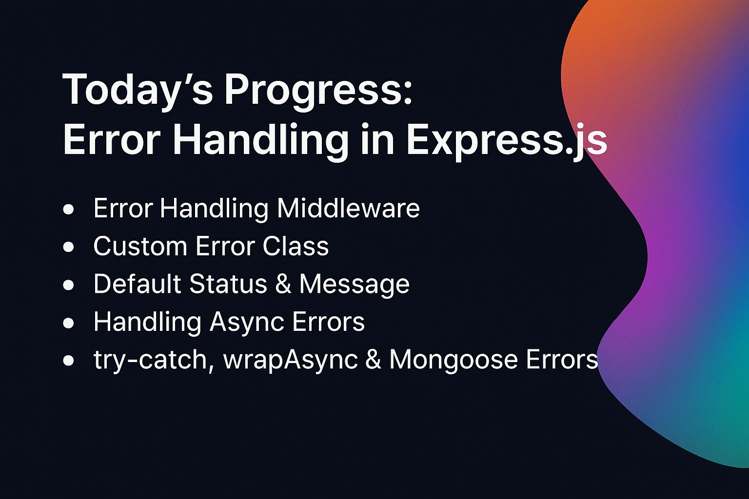 Abdul kheeyan @ABDUL_KHEEYAN · Jul 28, 2025 🚀Mastered Express.js Error Handling today! Covered: Middleware Custom Error Class Async Errors (try-catch & wrapAsync) Mongoose Error Handling Building clean, reliable backend APIs #MERN #Nodej #Expressjs #BackendDevS 1 12