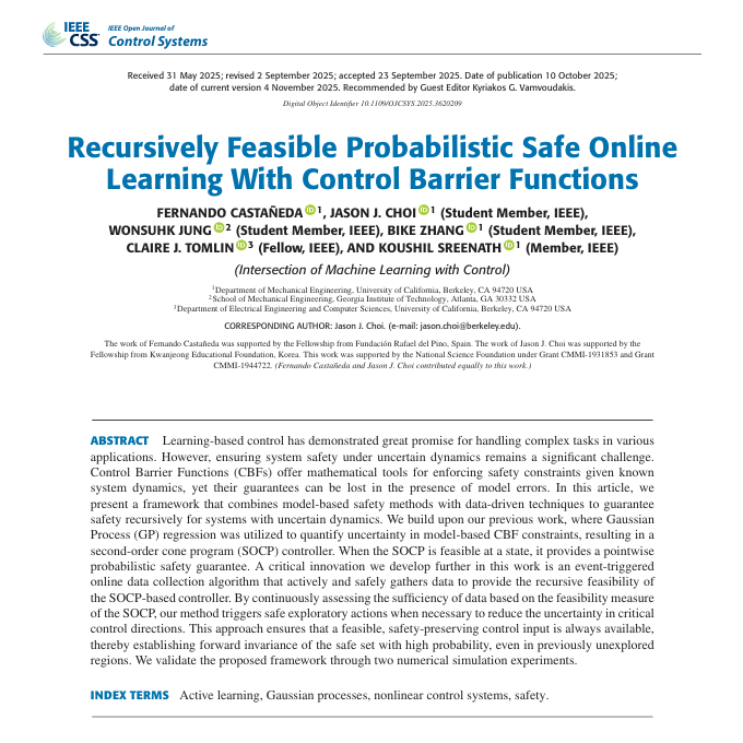 "Recursively Feasible Probabilistic Safe Online Learning With Control Barrier Functions," by Fernando Castañeda; Jason J. Choi; Wonsuhk Jung; Bike Zhang; Claire J. Tomlin; Koushil Sreenath Date: 10 Oct 2025 Link: ieeexplore.ieee.org/document/11199… #safety #nonlinearcontrol #controlsystems