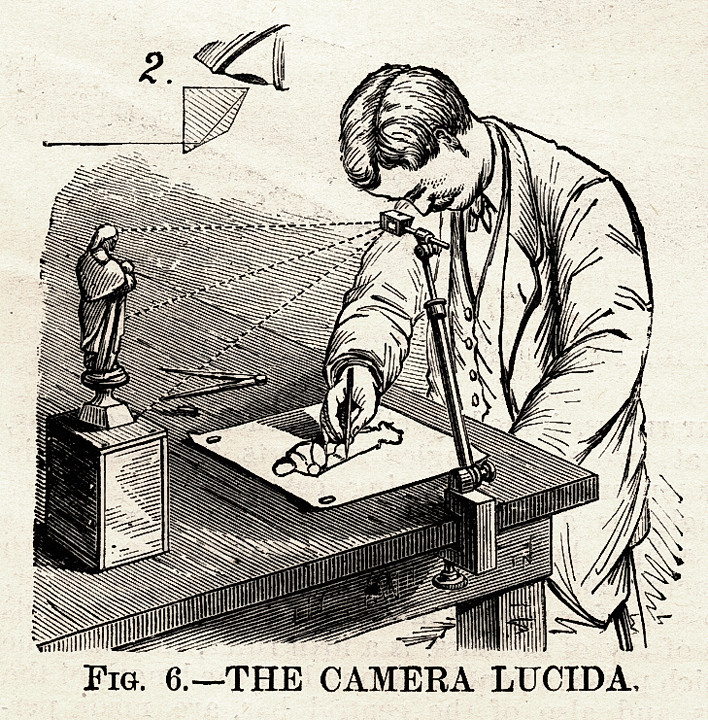 Among many other pursuits, he eventually facilitated the accurate sketching of objects through the Camera Lucida, a four-sided prism mounted on a small stand above a sheet of paper.