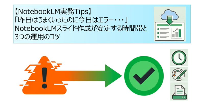 【NotebookLM実務Tips】「昨日はうまくいったのに今日はエラー・・・」NotebookLMスライド作成が安定する時間帯と3つの運用のコツ|しげちーSS