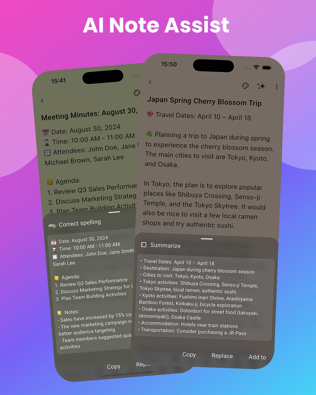 • Summarize long notes instantly