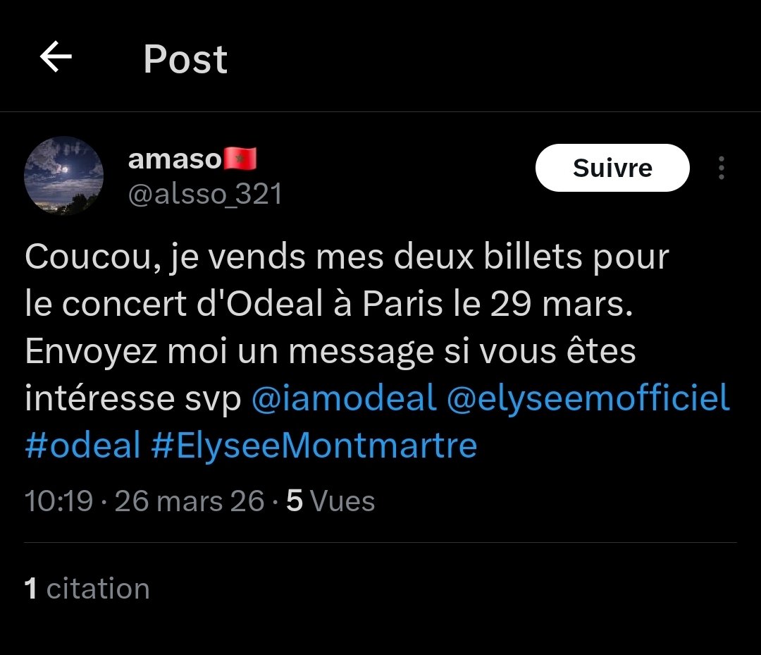 Dalmasso 🇩🇿 @alsso_321 · 7h Salut, je vends deux billets pour le concert d'Odeal à Paris le 29 mars. Contactez moi si vous êtes intéressé 🙏 @iamodeal @elyseemofficiel #odeal #ElyseeMontmartre 62