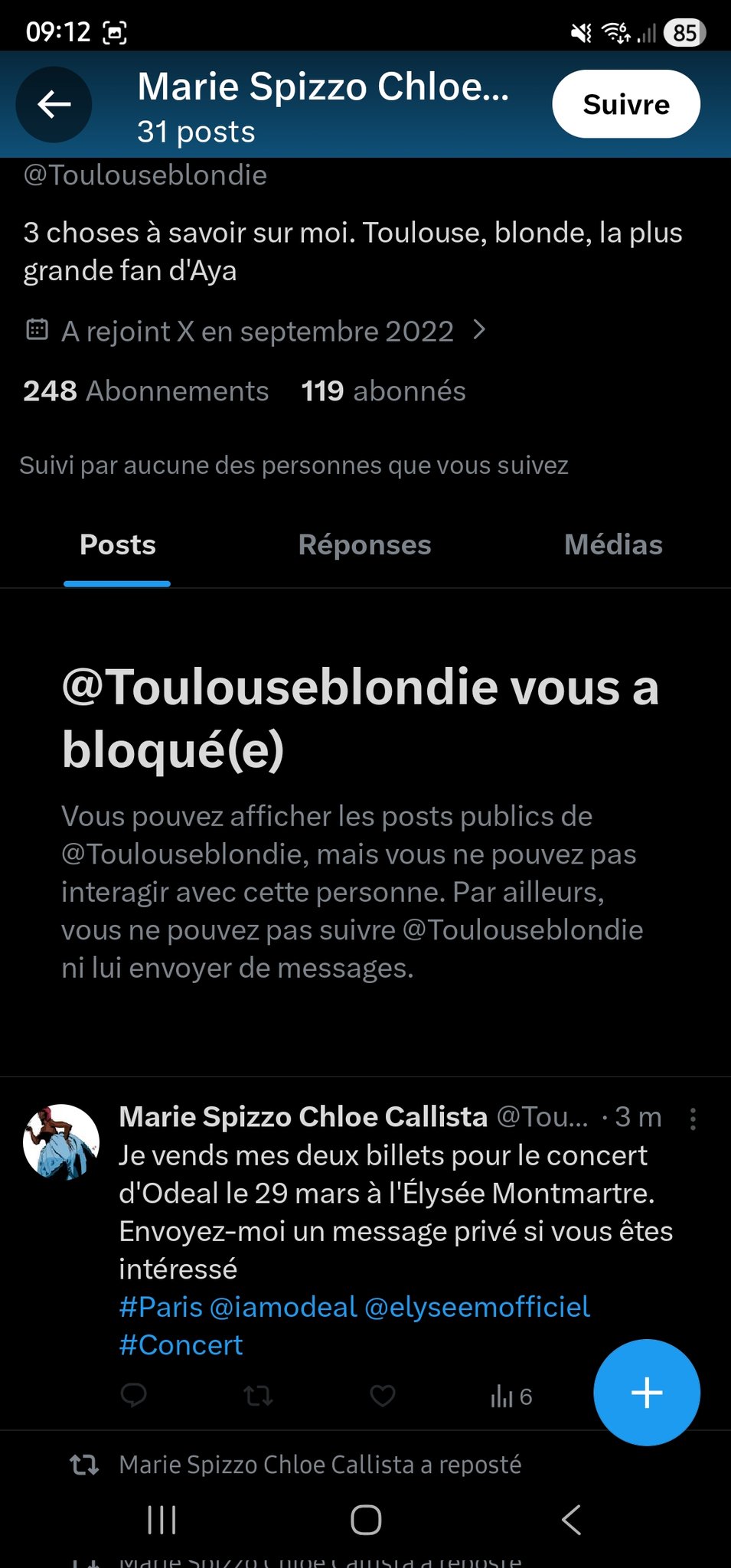 🎀Mélnk🇨🇩 @Melnknz · 1d Les gars n'achetez pas votre place pour #Odeal chez " Marie Spizzo Chloe Callista " #concertodeal #Paris c'est une arnaqueuse. Depuis elle repost le même tweet. Elle m'a pas envoyé ma place !! #elyseemonmartre 1 196