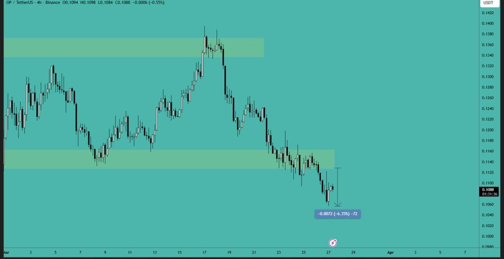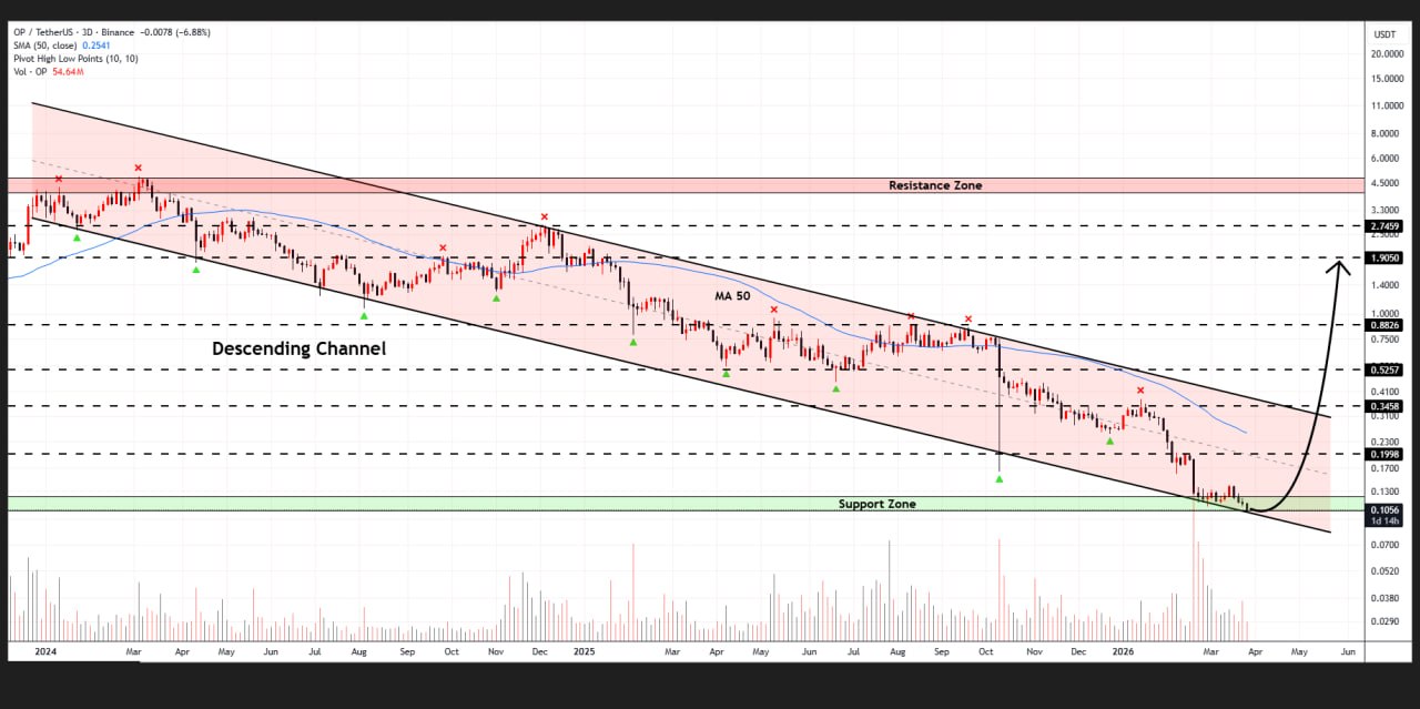 OP printing its all-time low 20 days ago, going through consolidation. Price is holding above the key support zone at $0.112–$0.116, indicating strong demand and Resistance at $0.133–$0.137 continues to cap upside. A breakout above $0.137 could push price toward upport may lead to a retest of the lows. Overall, the market appears to be in an accumulation phase with potential for downwards continuation.