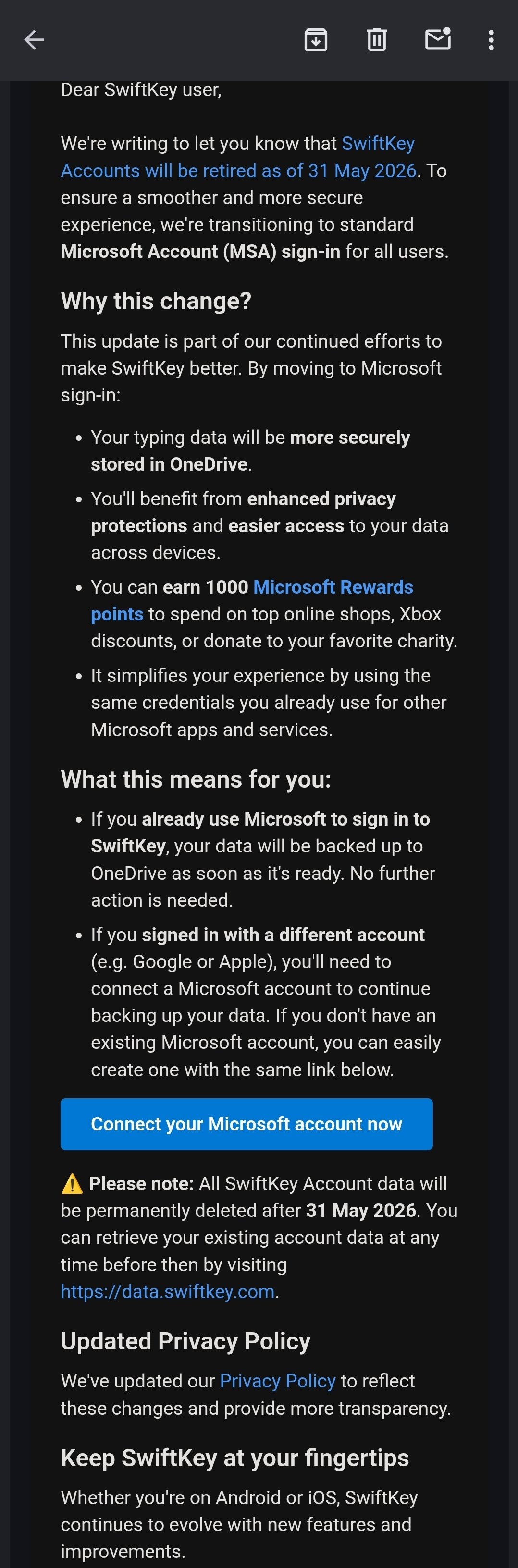 🫠 Microsoft retiring SwiftKey standalone accounts? Translation: your cloud keyboard “backup” is now tied to a Microsoft Account and OneDrive. May 31, 2026 = plan your typing migration now.windowsforum.com/threads/swiftk…9