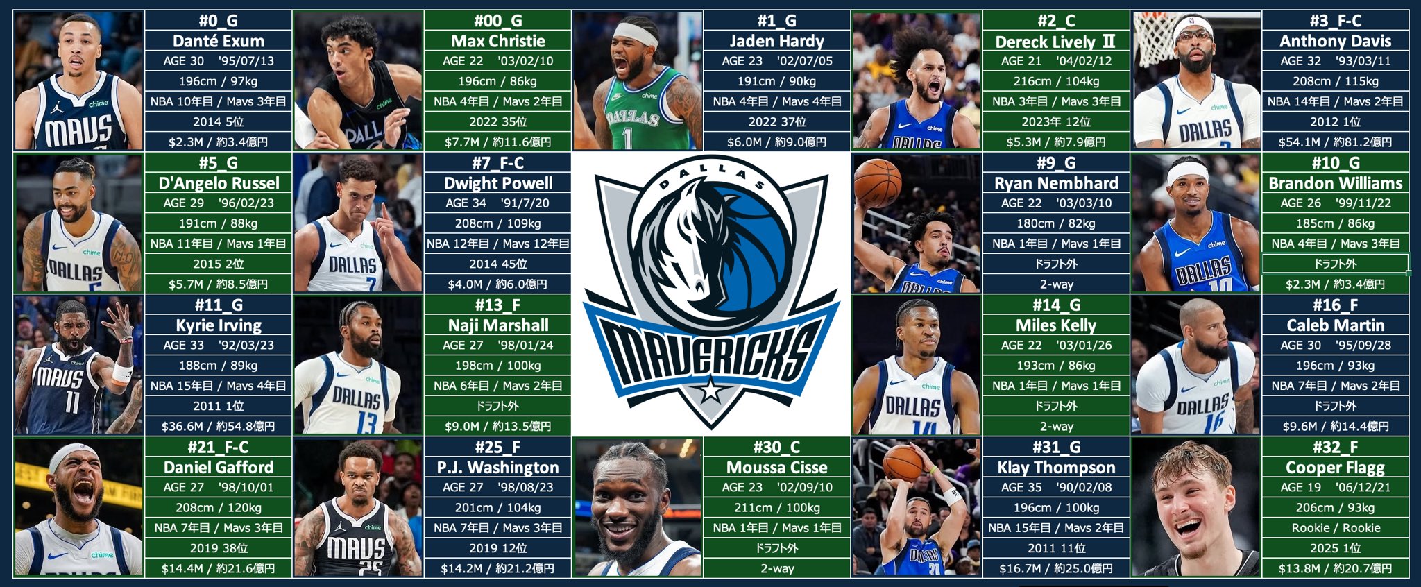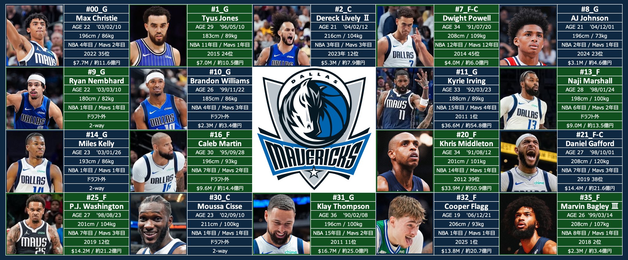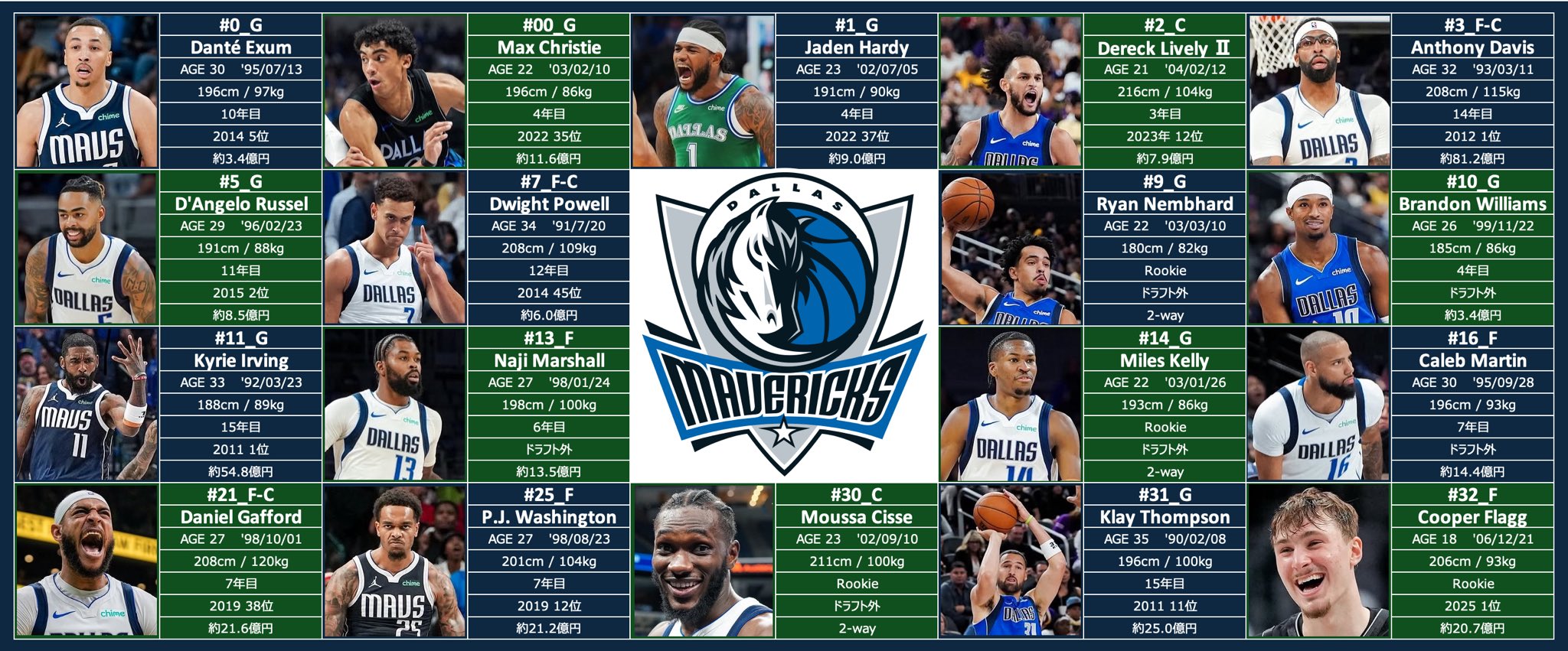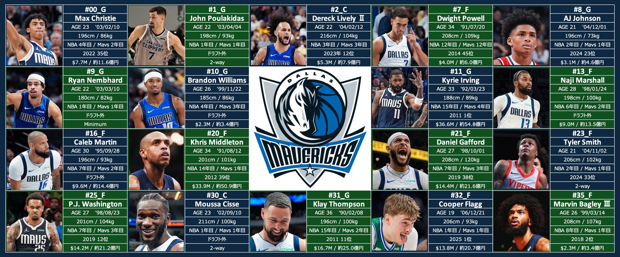 Mavsai @mavsaisai · Nov 27, 2025 25-26 Mavs Roster マブスのロスターをまとめました! ・背番号/ポジション ・名前 ・年齢 / 誕生日 ・身長 / 体重 ・経験年数 ・ドラフト順位 ・年俸 みんなで一緒にマブスを応援しましょう! Let’s go Mavs!! #MFFL #OneForDallas 2 738