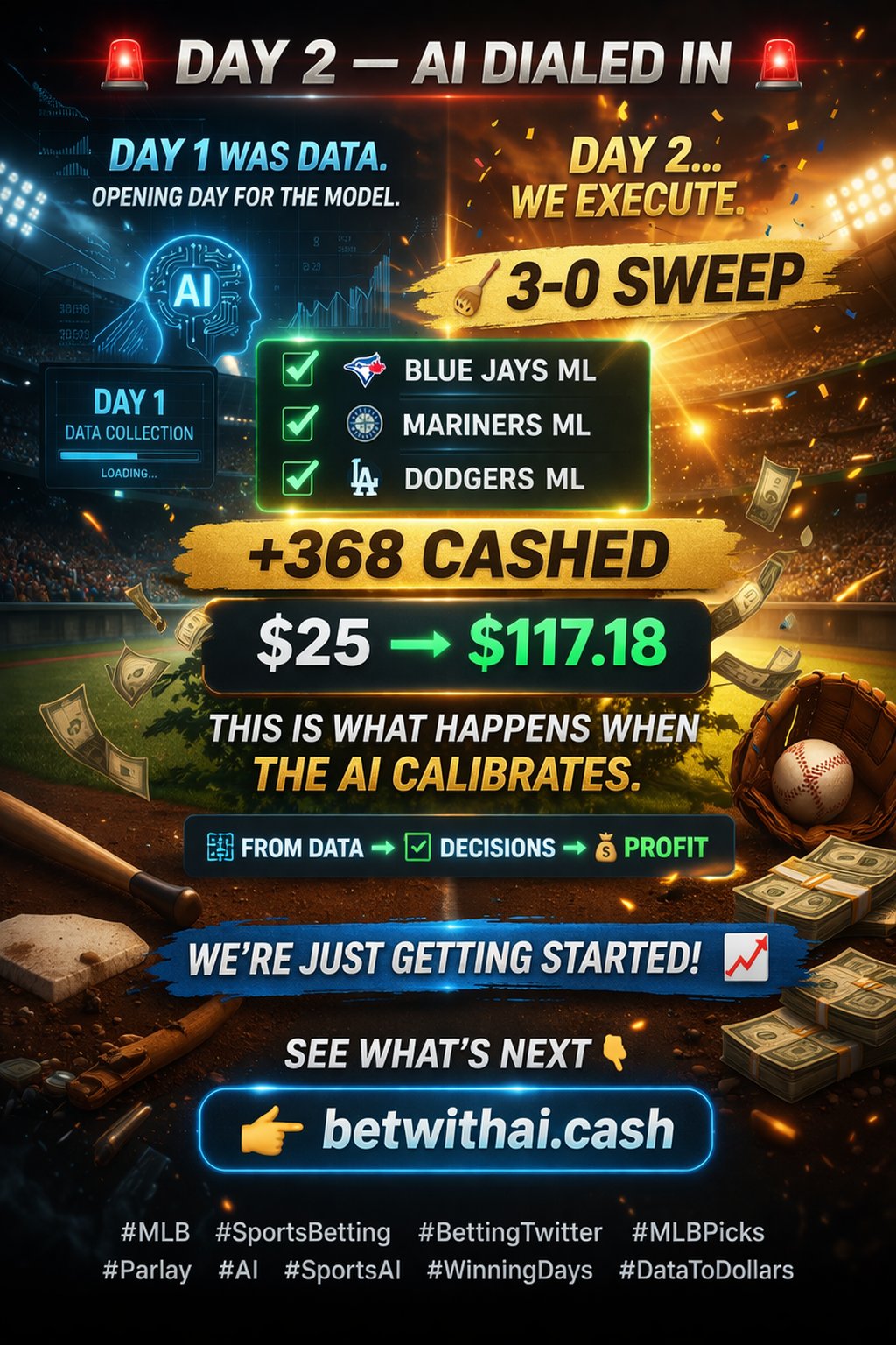 BetWithAI @Bet_With_AI · 4h Day 1 we collect data. Day 2 we cash in Happy #OpeningDay2025 ai betwithai.cash BetWithAI @Bet_With_AI · 6h 👀 6