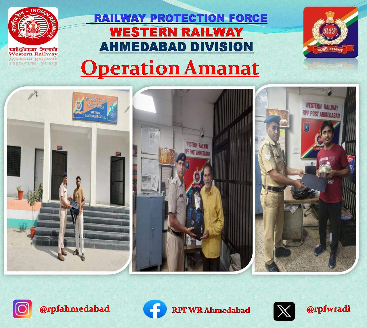 #OperationAmana On 17.03.2026, alert RPF staff returned three articles of misplaced passenger luggage, valued at Rs. 1,22,000/- in separate incidents at Ahmedabad and Gandhinagar stations. After verification, they were handed over to their rightful owners. @rpfwr1 @RPF_INDIA