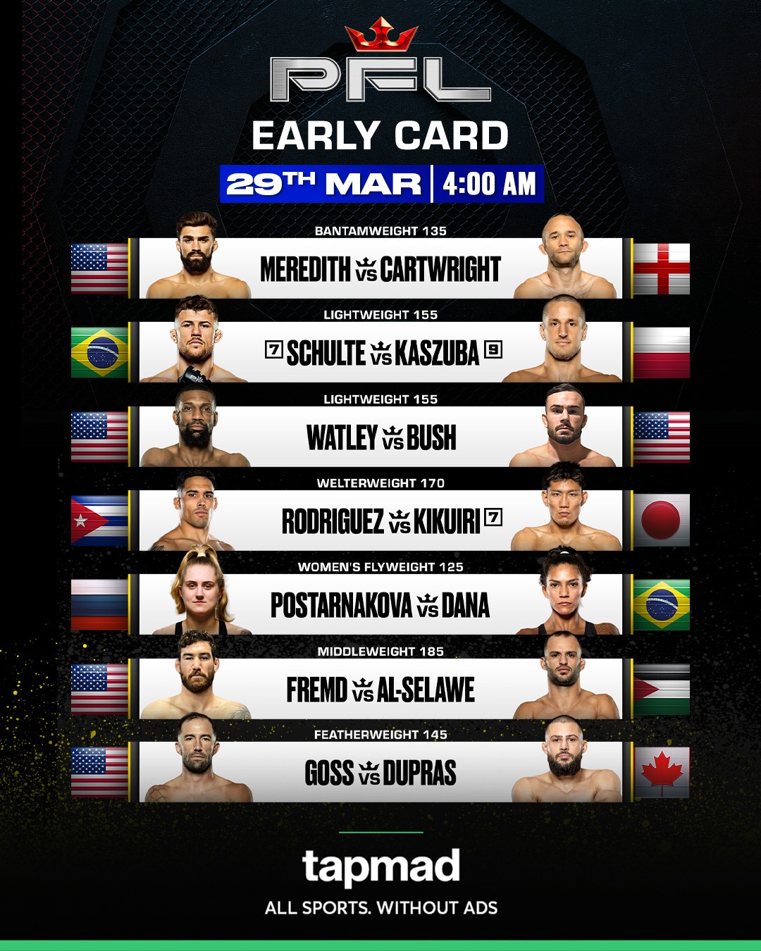 Catch every fight live in HD and without ads, only on tapmad!