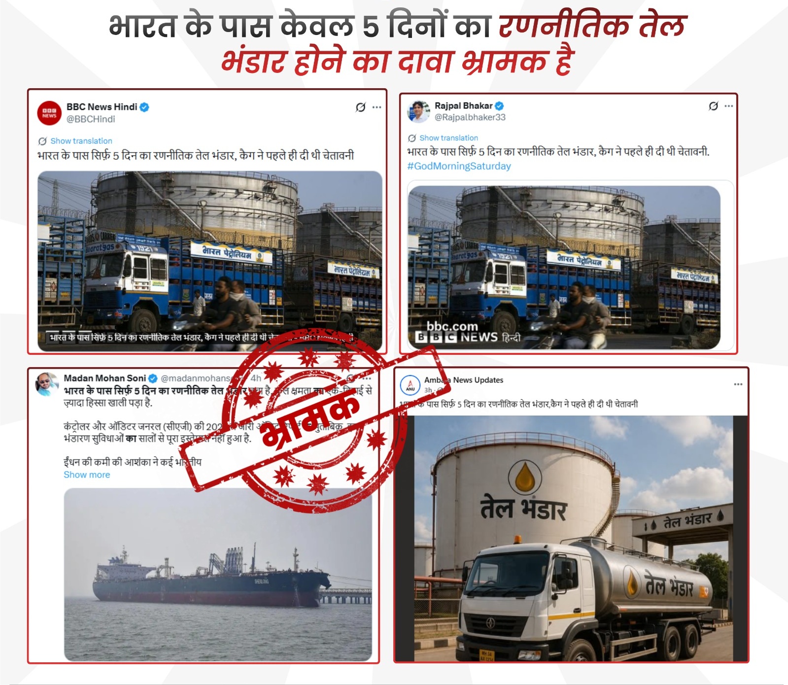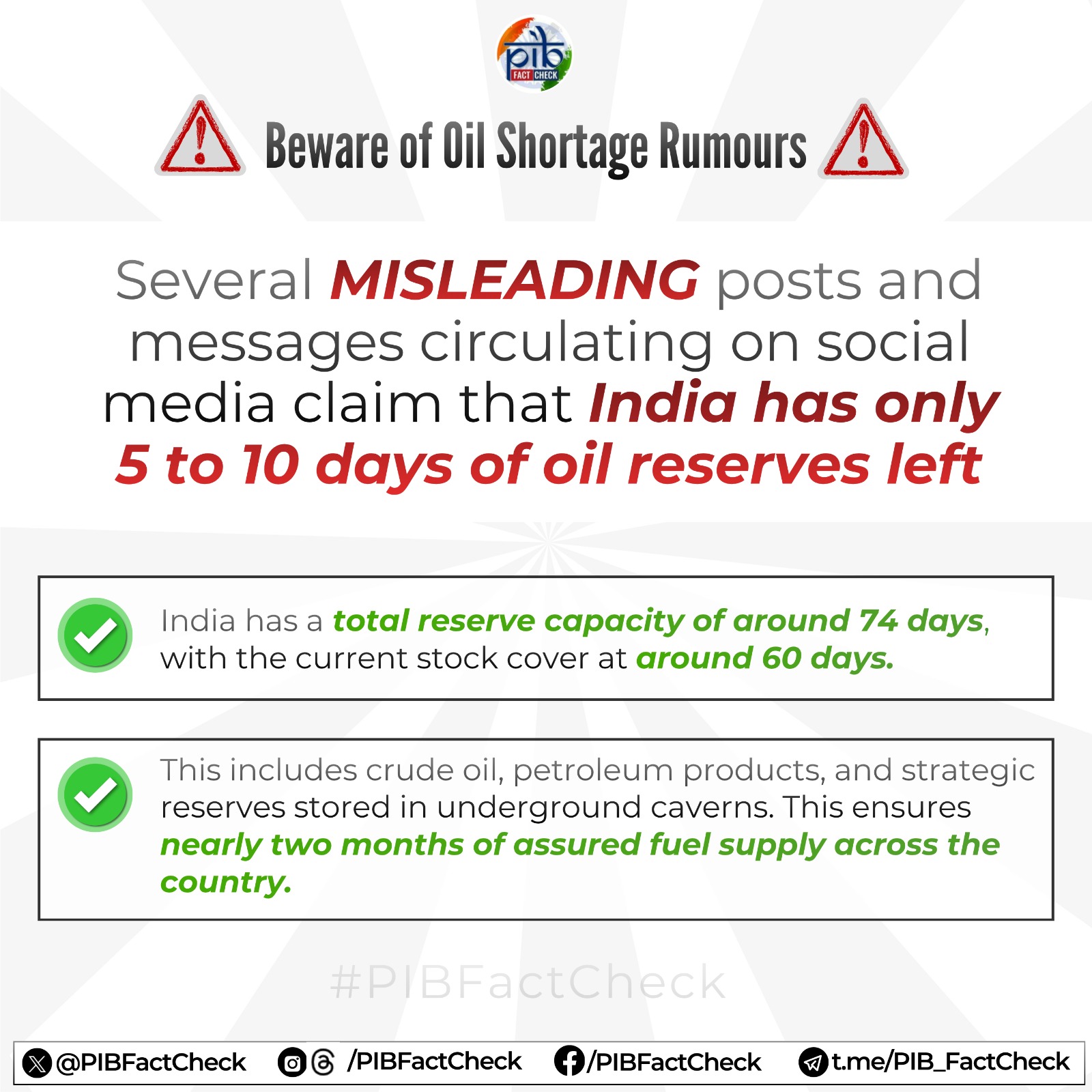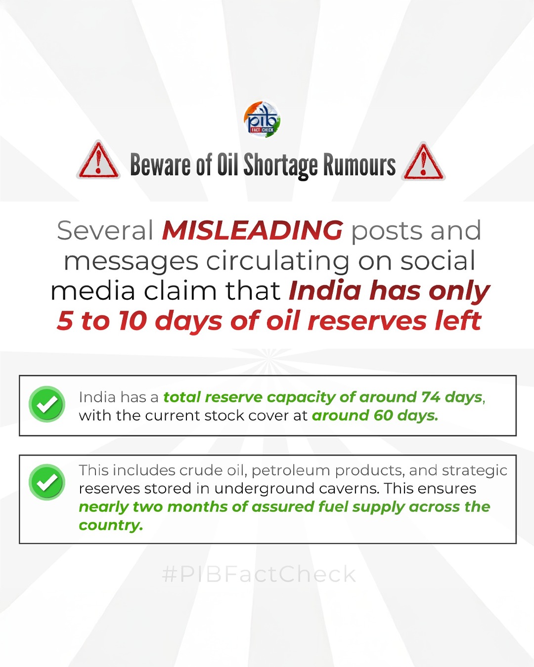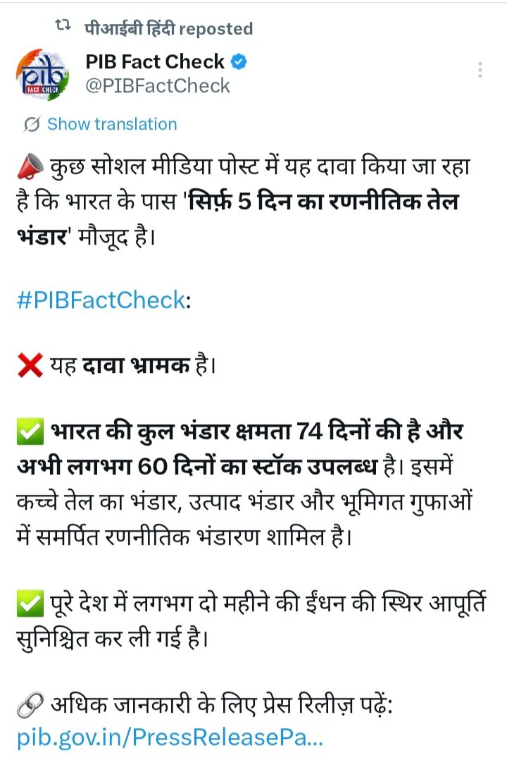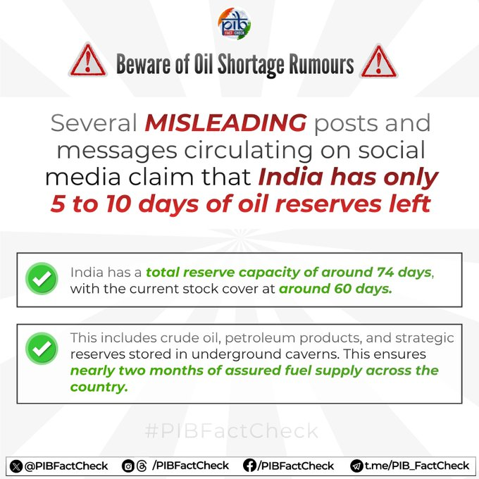 ಭಾರತದಲ್ಲಿ ಕೇವಲ 5-10 ದಿನಗಳ ತೈಲ ಸಂಗ್ರಹವಿದೆ ಎಂಬ ಸುದ್ದಿಗಳು ಸಾಮಾಜಿಕ ಜಾಲತಾಣಗಳಲ್ಲಿ ಹರಿದಾಡುತ್ತಿವೆ. ಈ ಕುರಿತು #PIBFactCheck ಸ್ಪಷ್ಟನೆ: