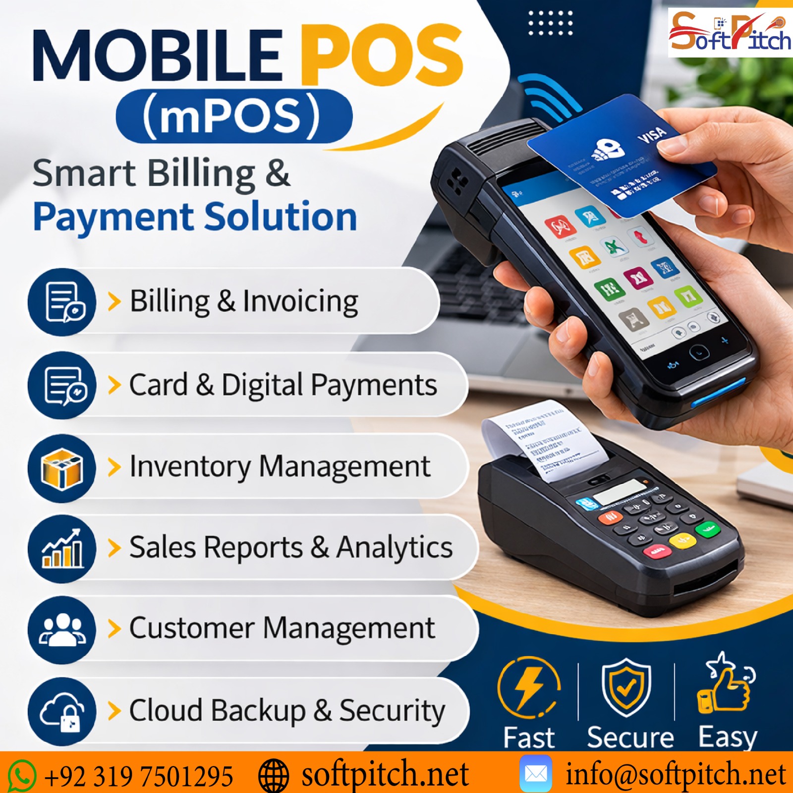 Upgrade your business with Mobile POS (mPOS) by SoftPitch – the ultimate smart billing and payment solution for modern businesses 💳📱