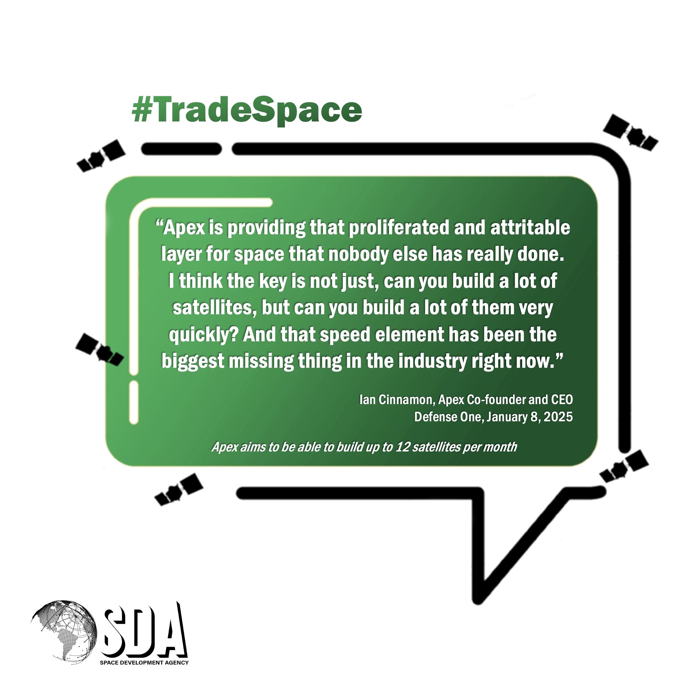 @ApexSpacecraft aims to disrupt the traditional delivery schedule by building and delivering satellites in just a few weeks. Apex is a member of SDA’s HALO pool, an acquisition approach to solicit and rapidly award prototype demos to support future #PWSA tranches. #TradeSpace