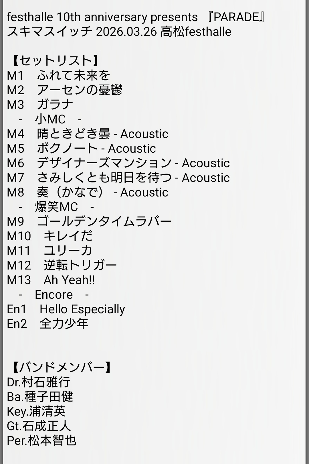 R-R-R @RRR13796389 · 2d 本日「festhalle 10th anniversary presents PARADE」開催!高松! そんな10周年イベントのスキマスイッチのセトリは下記ポスト記載のリンク先のページにて更新していきます。 #スキマスイッチ #festalle #PARADE ↓セットリスト↓ 1 274