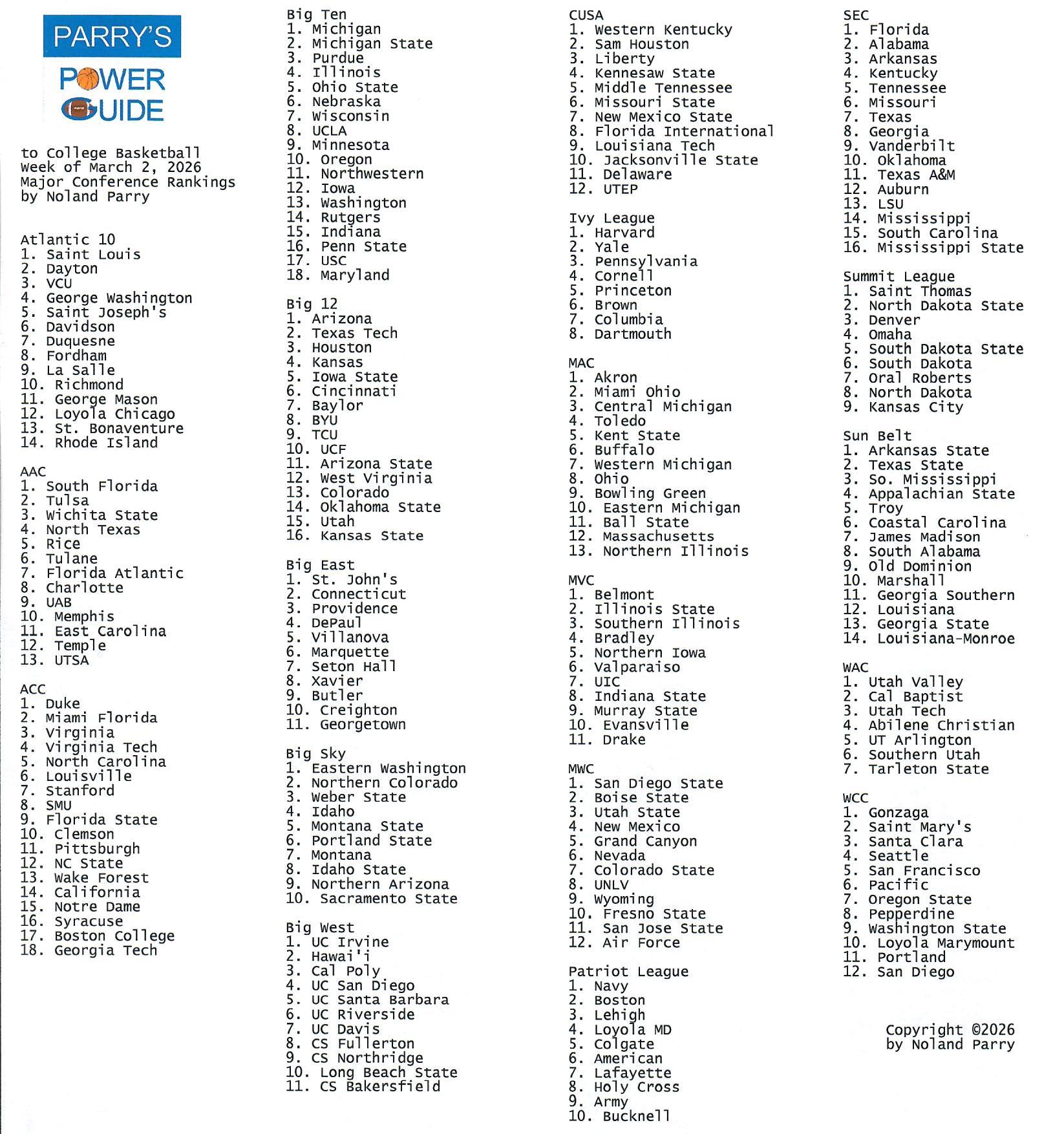 Noland Parry @Noland_Parry · Mar 2 #ParrysPowerGuide to #CBB This weeks major conference rankings @CBSSportsCBB @NCAA @CBBonFOX @espn #BYUSN 1 94
