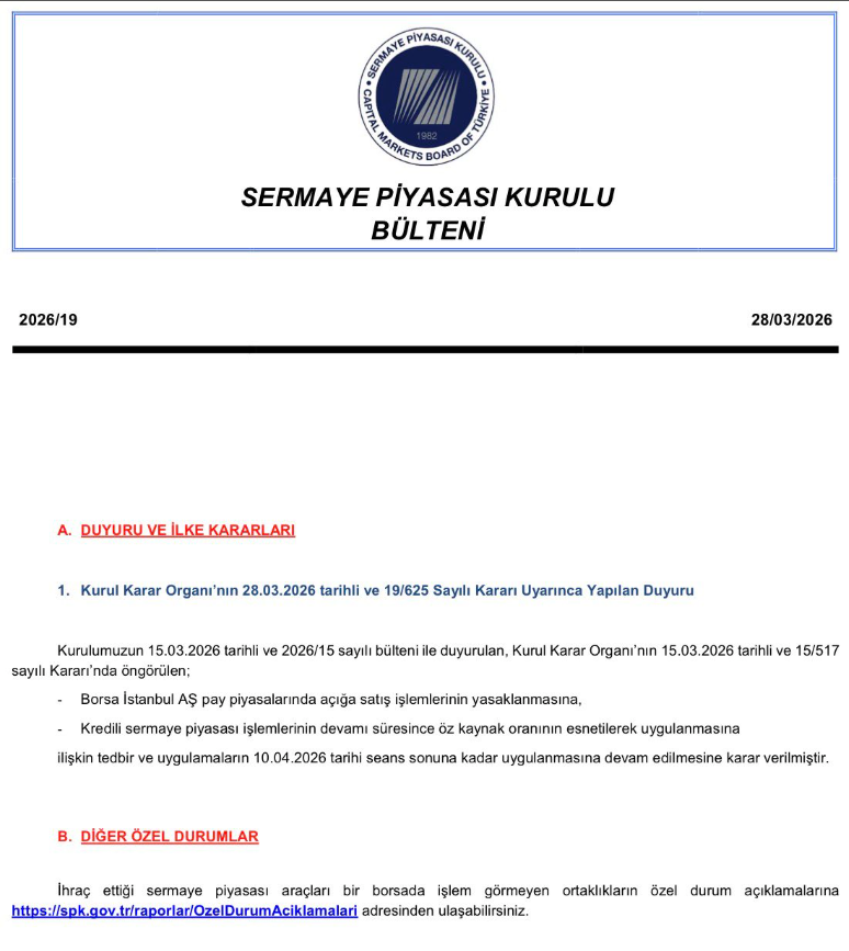 " SPK son bir bildirim ile açığa satış yasağı ve özkaynak esnetmesini 10 Nisan tarihine kadar tekrar bir uzatma kararı aldı. "