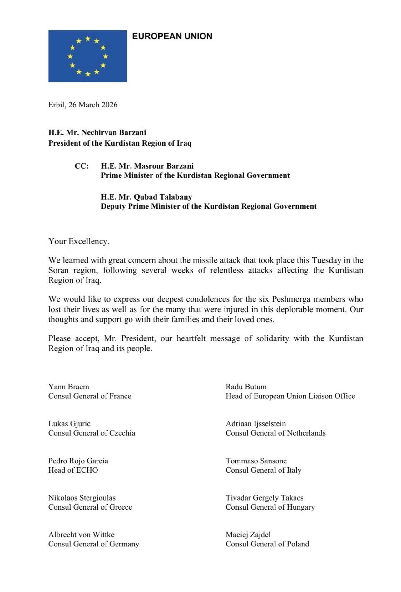 Il Consolato Generale d’Italia a Erbil esprime il più profondo cordoglio alle famiglie dei sei Peshmerga caduti, al popolo curdo e alle autorità della Regione del Kurdistan per la tragica perdita di sei valorosi combattenti. In questo momento di grande dolore, ci uniamo al lutto per la scomparsa di uomini che hanno servito con coraggio, dedizione e senso del dovere. Il loro sacrificio non sarà dimenticato. Rivolgiamo inoltre un pensiero sincero ai feriti, con l’augurio di una pronta e completa guarigione.
