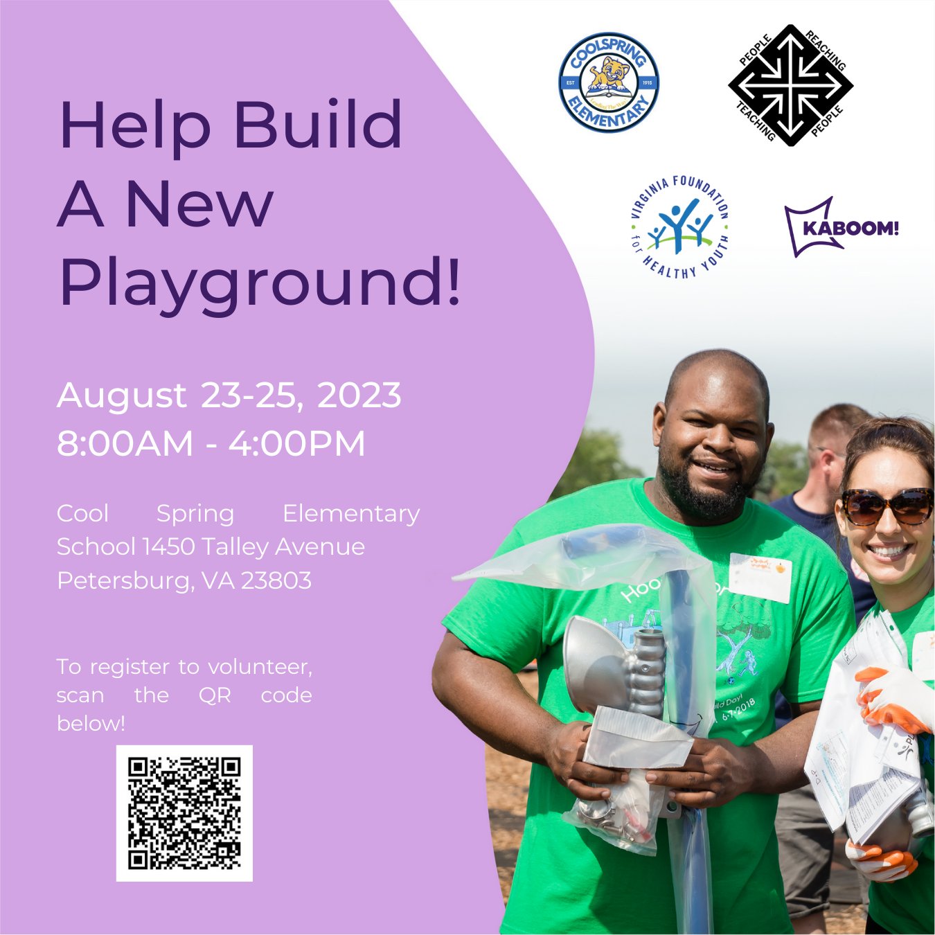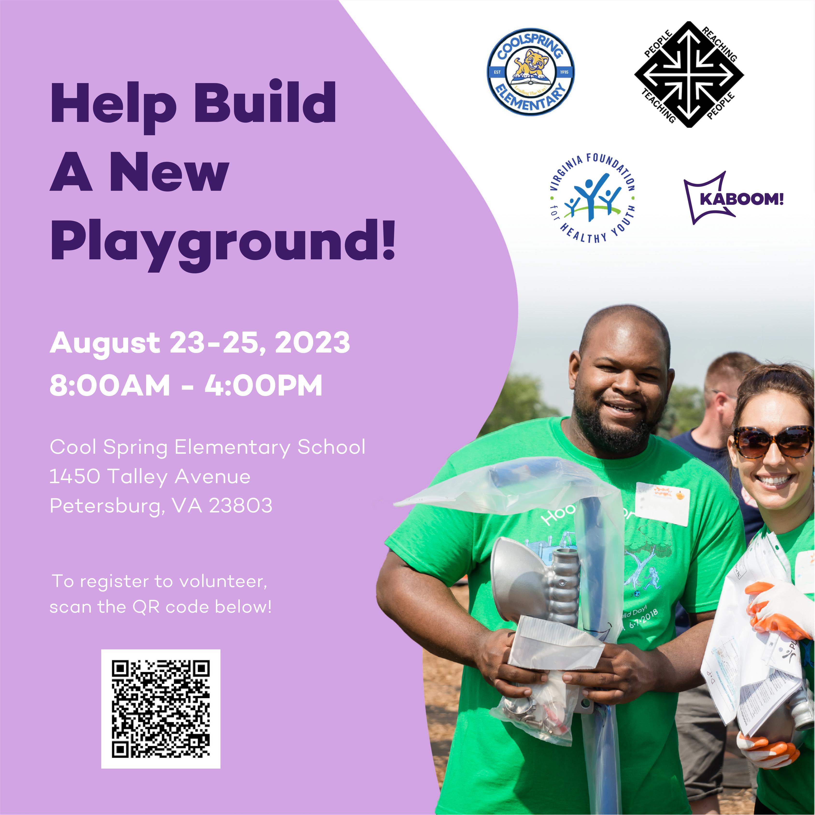 🎉 Play, Build, Party! 🛠️ Join us for the ultimate playground mission with KaBoom! & VFHY partnering with PCPS for Cool Spring Elementary. FREE childcare, t-shirt, food, DJ – it's a playground extravaganza! Be a hero – sign up now to make magic happen. 👉 #PlaygroundBuioRM