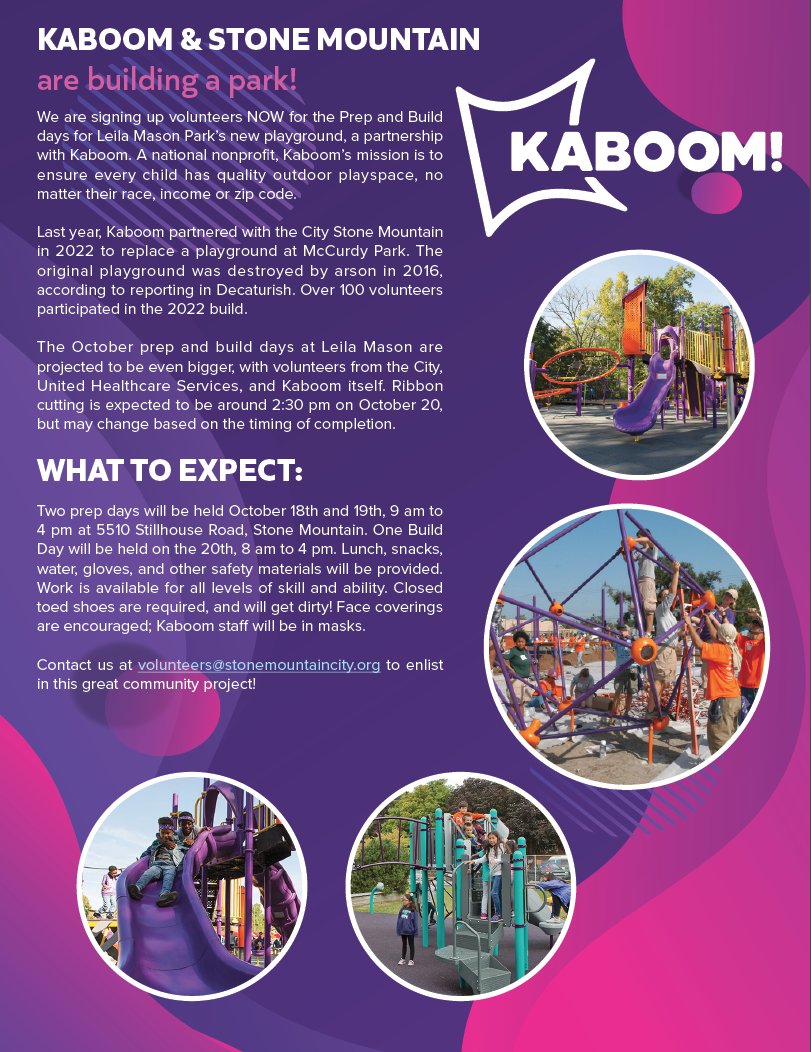 Countdown Alert! Just one more week until the KABOOM Park Build at #LeilaMasonPark in the #CityofStoneMountain. 📅 Prep Days: Oct 18-19, 9 am - 4 pm