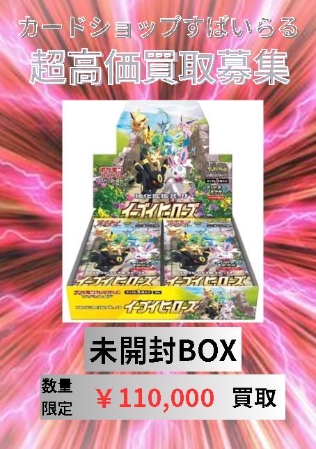 カードショップすぱいらる 日本橋店 @supairaruotaro · 2d 📢【ポケモンカード未開封BOX買取情報】📢 《イーブイヒーローズ》シュリンク付き未開封BOX ✨✨✨1BOX ¥110,000買取✨✨✨ シュリンク、BOXの状態等により大幅に減額となる場合がございます #ポケモンカードゲーム #pokemo #未開封BOX #シュリンク付き #トウホク #オタロード #日本橋 #30周Dh 376