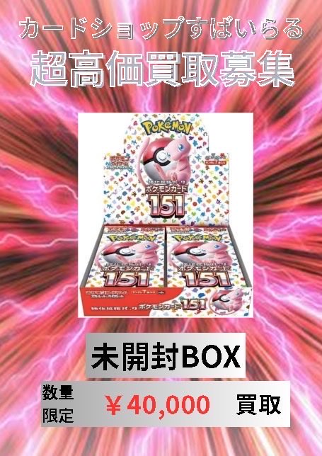 カードショップすぱいらる 日本橋店 @supairaruotaro · 4d 📢【ポケモンカード未開封BOX買取情報】📢 《151》シュリンク付き未開封BOX ✨✨✨1BOX ¥40,000買取✨✨✨ 皆様のお持ち込みお待ちしております🙇♂️ #ポケモンカードゲーム #pokemo #未開封BOX #シュリンク付き #トウホク #オタロード #日本橋 #304ts 450