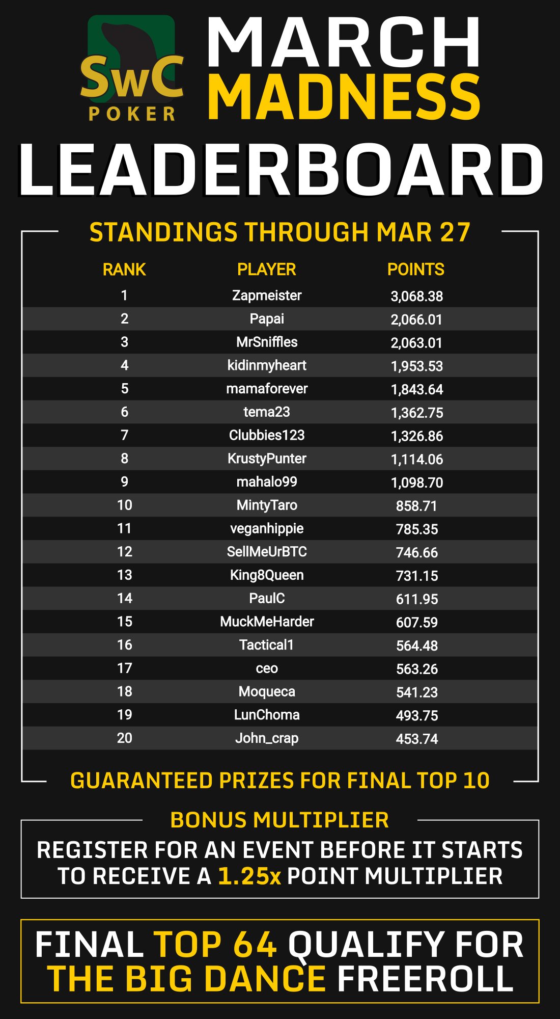 Updated March Madness #Bitcoin#Poker Series Leaderboard standings after Event 43 of 94
