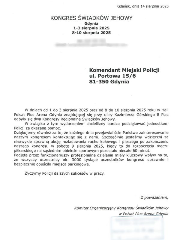 Policia nga #Gdynia, #Poloni me falënderime nga Komiteti Organizativ i Konventës së Dëshmitarëve të Jehovait