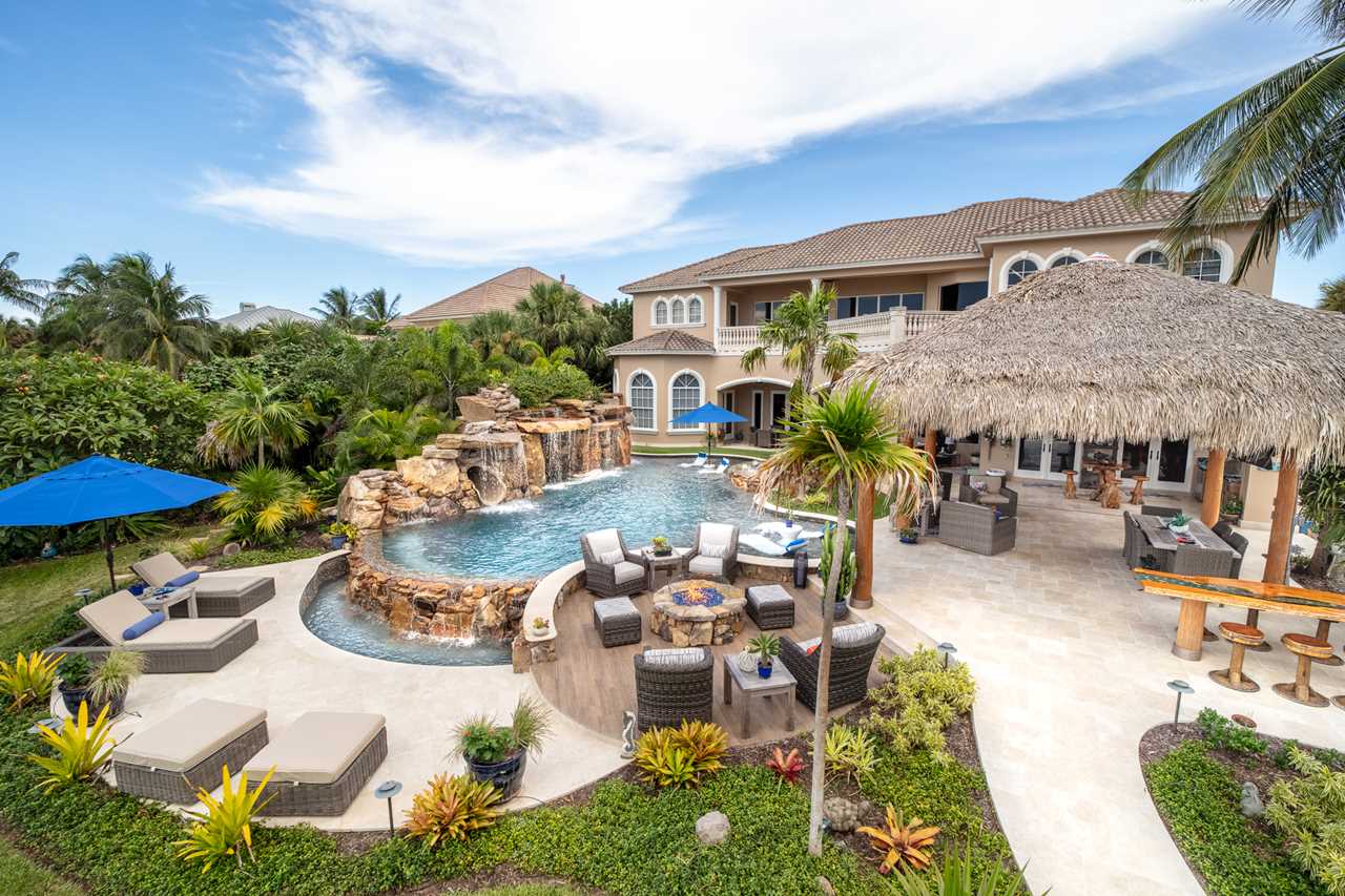 We not only created an amazing pool, but we also created the ultimate outdoor living space with so many features: a tiki Hut, a hidden water slide, spa, massive grotto, sun shelf, infinity edge, firepit, and the list goes on. #insanepools #lucaslagoons #pool