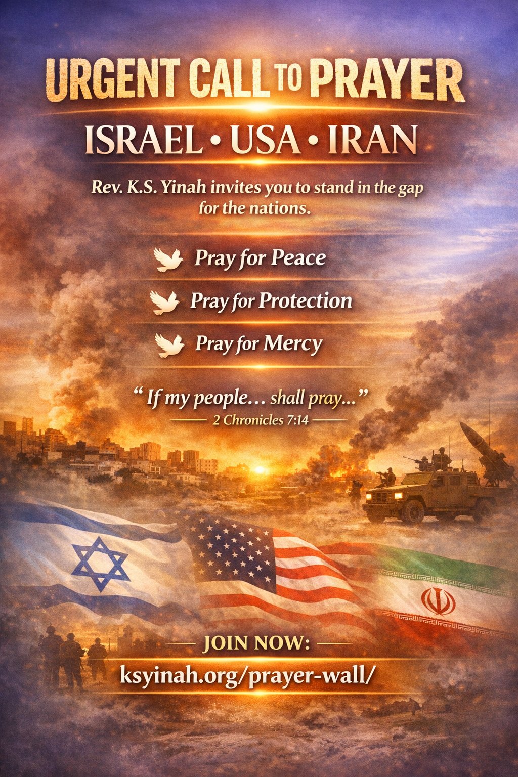 🚨 URGENT: CALL TO PRAYER 📷 Rev. K.S. Yinah has released powerful prayer points for Israel, USA & Iran. This is not the time to watch… It’s time to PRAY!ksyinah.org/prayer-wall/i2r “Pray without ceasing.” — 1 Thessalonians 5:17 #PrayForPeace #ChurchAriXb9