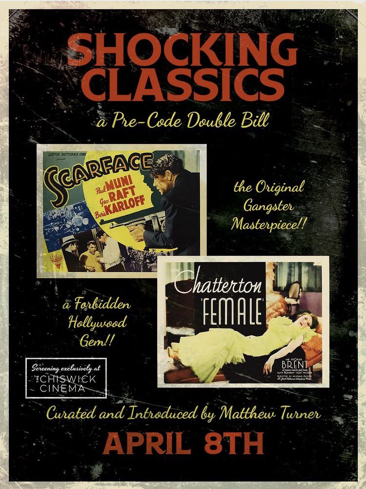 Some good news! I’m curating a #PreCode double bill of Scarface (1932) and Female (1933) at the @ChiswickCinema on April 8th. All shares appreciated. Tell your friends! Etc. #PreCodeApril