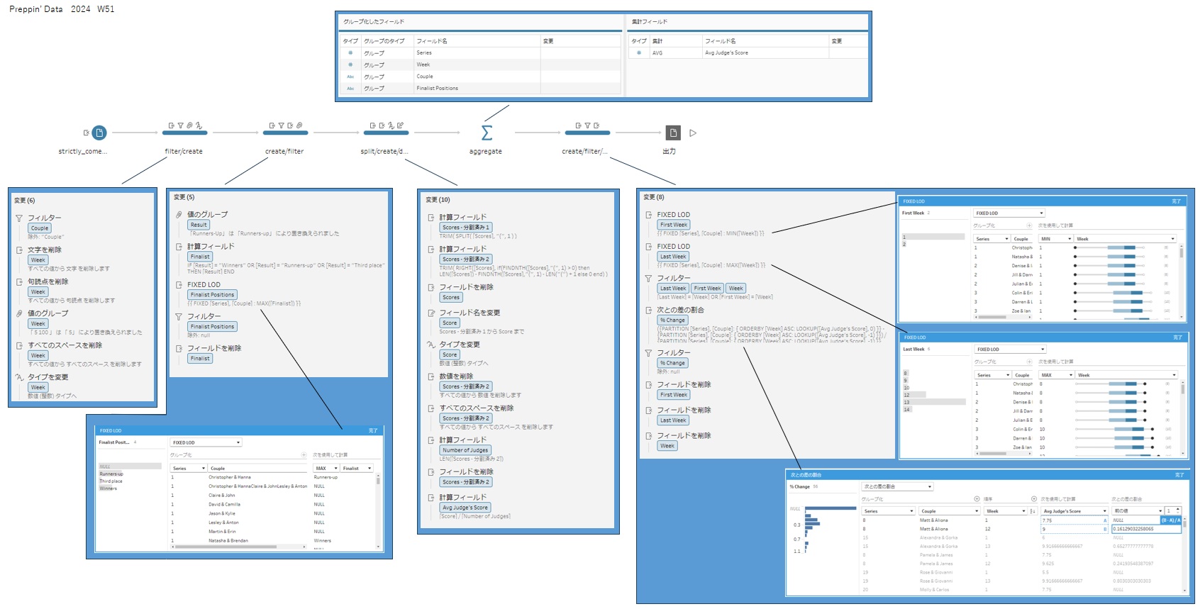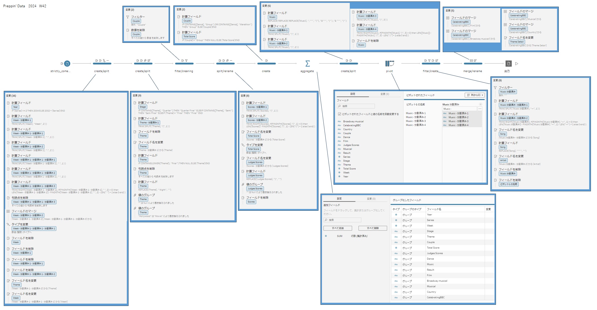Masa Hamamo @05_hamah · Jan 16 #PreppinData 2024: Week 42 Strictly Come Dancing Thank you @Datajedininja, @JennyMartinDS14 & @TomProwse1 学び ・分割後のフィールド名を変更せずに処理を進めると後で混乱するので、分割後の項目が必要ならフィールド名を変更し、不要なら削除する #Tableau PD2024_W42_20260117 3 45