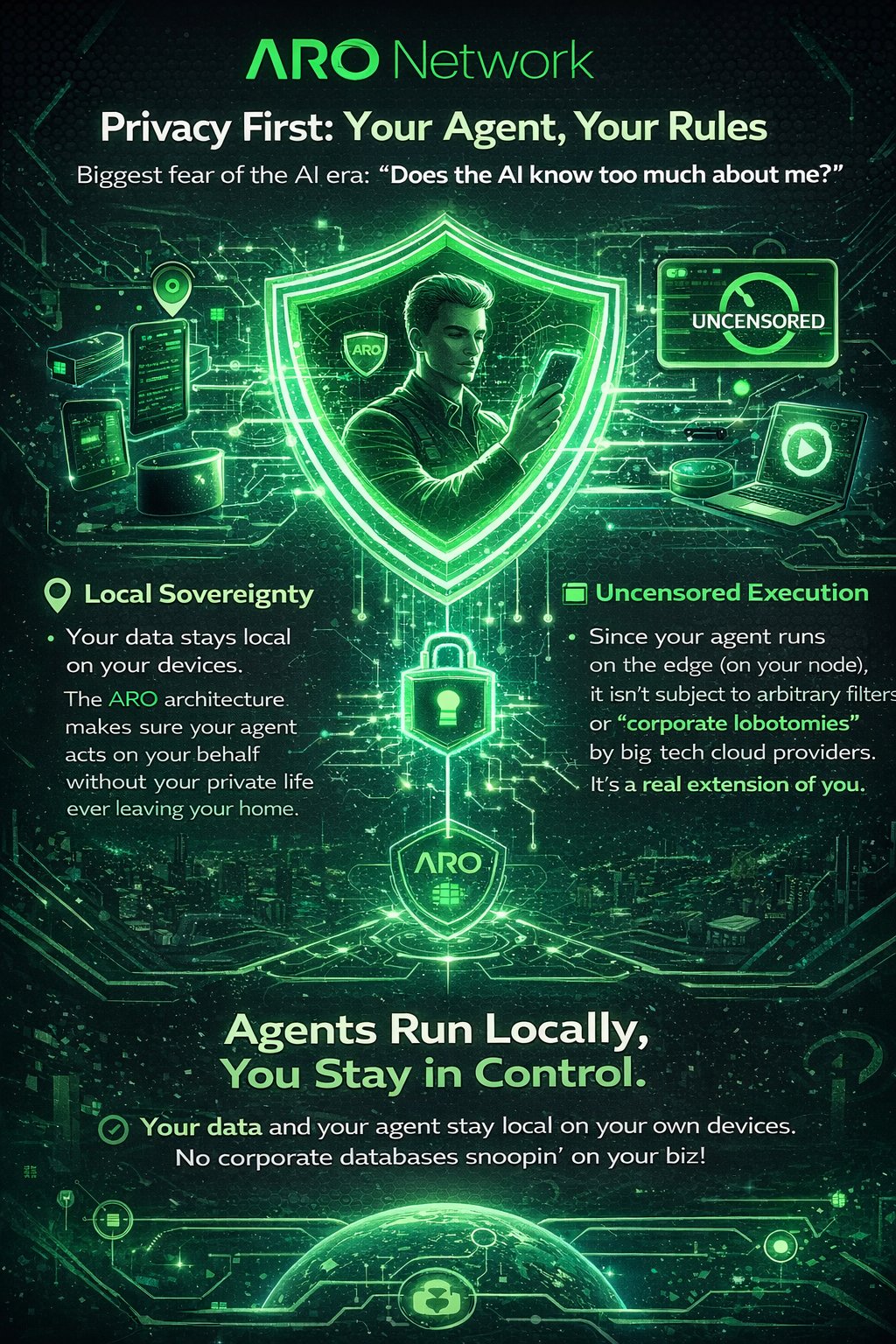 With ARO Network, your agent runs locally, your data stays on your device, and you stay in control.