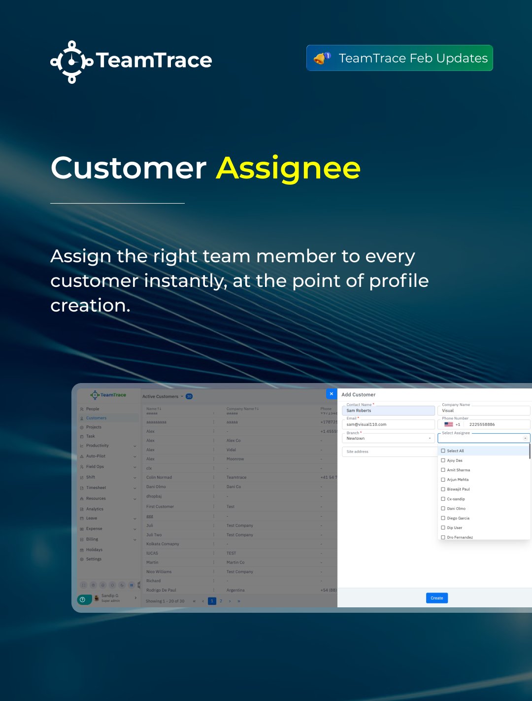 With the new Customer Assignee feature in TeamTrace, every customer profile now has one dedicated team member assigned to it, right from the moment it's created.
